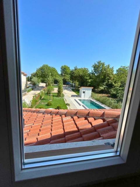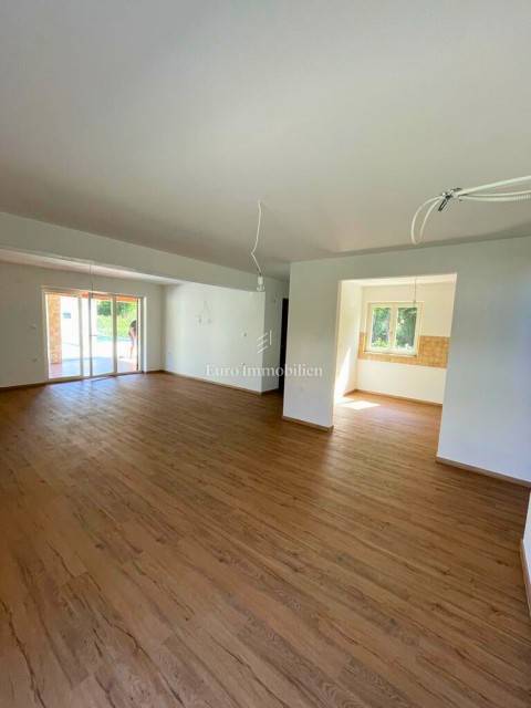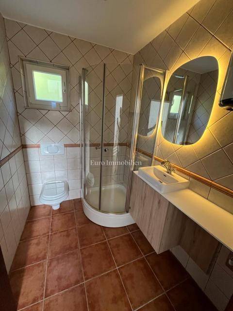 It was built on a large plot of approx. 1100m2. The house is located in a quiet location near Dobrinj, which offers a peaceful summer idyll on the island of Krk. It spreads over 250 m2 and extends over two floors. It consists of four bedrooms, three bathrooms, living room with a kitchen and dining room. The house also has a large garden of 960m2 with a swimming pool and parking spaces for several cars.