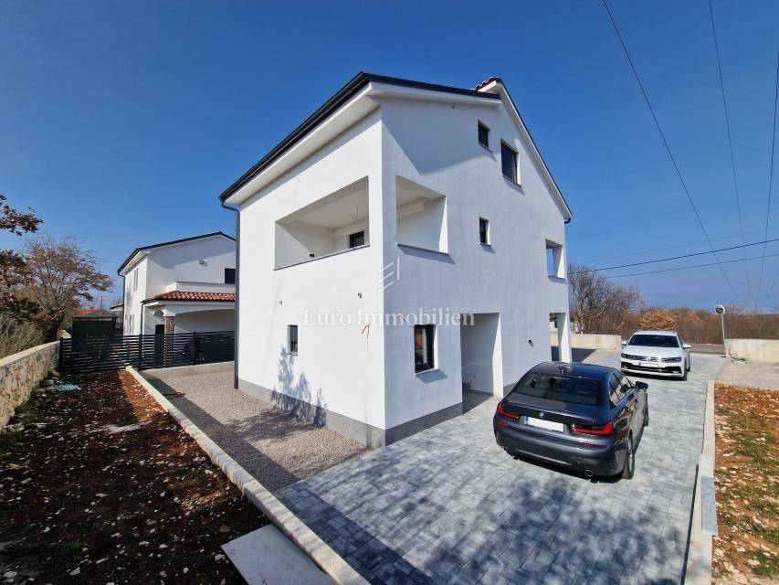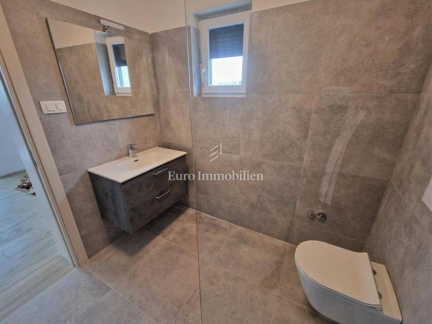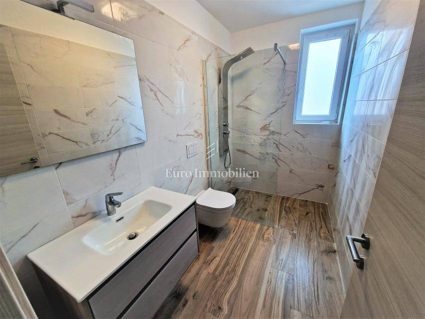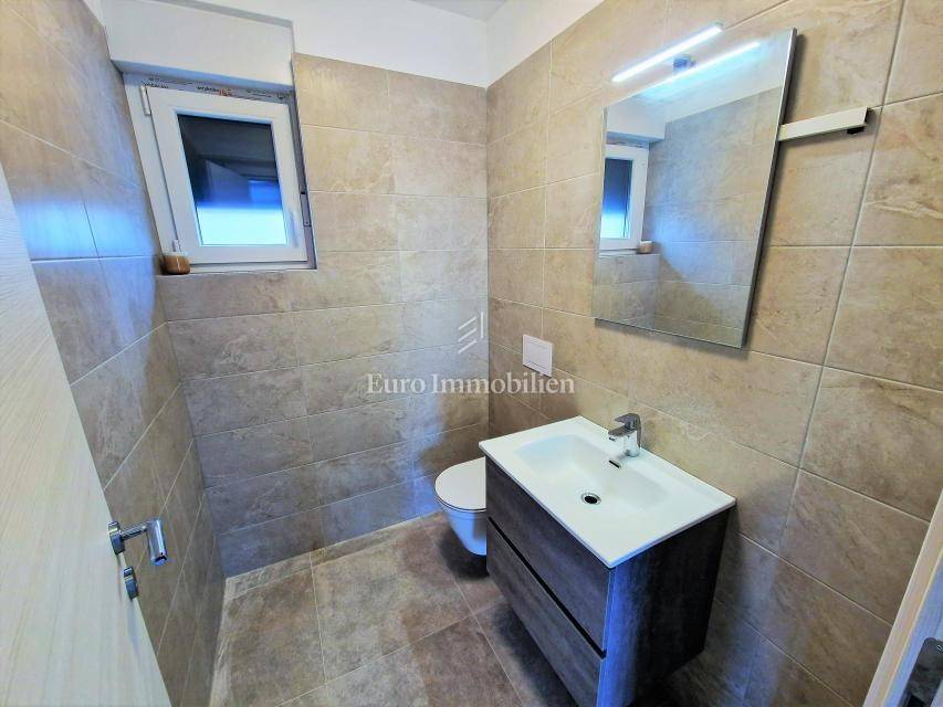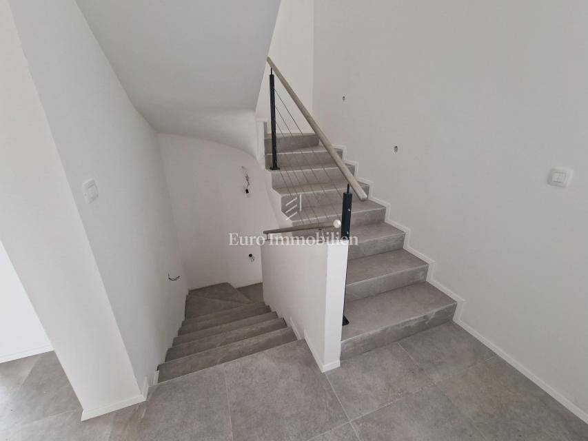 The house has a living area of 193m2 and was built on a plot of 657m2. It is divided into three floors - ground floor, first floor and attic. On the ground floor there is a living room with a kitchen, a storage room or a laundry room, and a toilet. On the first floor, there are two bedrooms, each with its own bathroom, and two terraces - one facing the sea, the other facing the interior and greenery. The attic is ideal for a large master bedroom or two smaller bedrooms with a bathroom. Underfloor heating is installed in the bathrooms. In the attic there is also a terrace with an open view of the sea. There is a jacuzzi on the terrace. The house also has a garden where there is parking for several cars and it is possible to build a swimming pool. It is located in a quiet location, approx. 2.5 km from the sea. Contact us for more information!