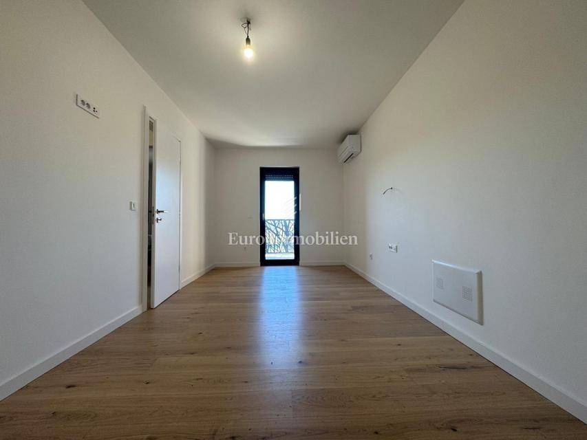 The houses have a very similar layout, and their net living area is 136.40 m2 and 136.50 m2. One has 150 m2 of garden, and the other has 250 m2. On the lower floor there is a corridor,, WC, a storage room, and a large living room with a kitchen and dining room. The living room leads to a covered terrace. On the upper floor there is a hallway, two bathrooms and three bedrooms. On this floor there is also an additional storage room and another covered terrace. All rooms will have oak three-layer parquet, while high-quality first-class Italian porcelain and high-quality sanitary ware will be installed in the bathrooms, storage rooms and terraces. Four air conditioners are provided for heating and cooling. Hot water consumption is provided through a heat pump with a 250-liter tank, and there is the possibility of connecting to solar panels. The joinery is high-quality PVC, and the lifting-sliding walls are made of triple-layer glass with an electric motor for blinds. In the parking lot, there are pavers and preparation for the installation of electric vehicle chargers. The planned completion is March 2024.