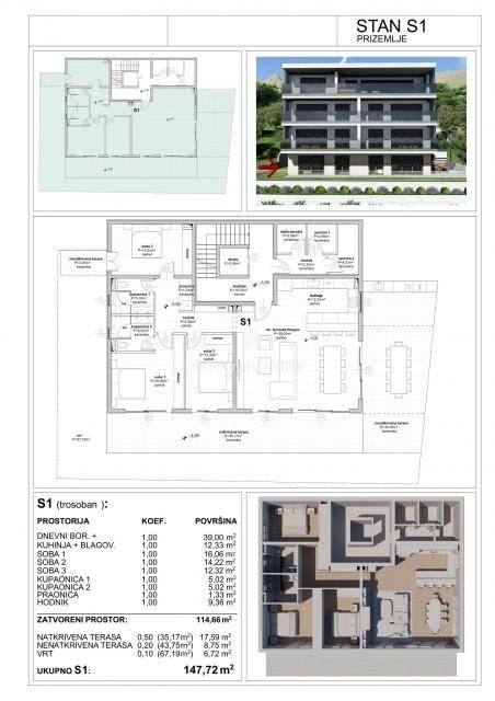 Apartment S1 with an area of 147.68 m2 occupies the entire ground floor and a spacious garden with a large garden and a terrace of 146 m2 with a built-in fireplace and space for a summer kitchen and outdoor dining. The interior of this apartment has three bedrooms, two bathrooms, a separate room - a laundry room, and a kitchen, living room and dining room that form one unique space, so the view of the sea extends from most of the apartment. The view of the sea from this apartment cannot be enclosed.