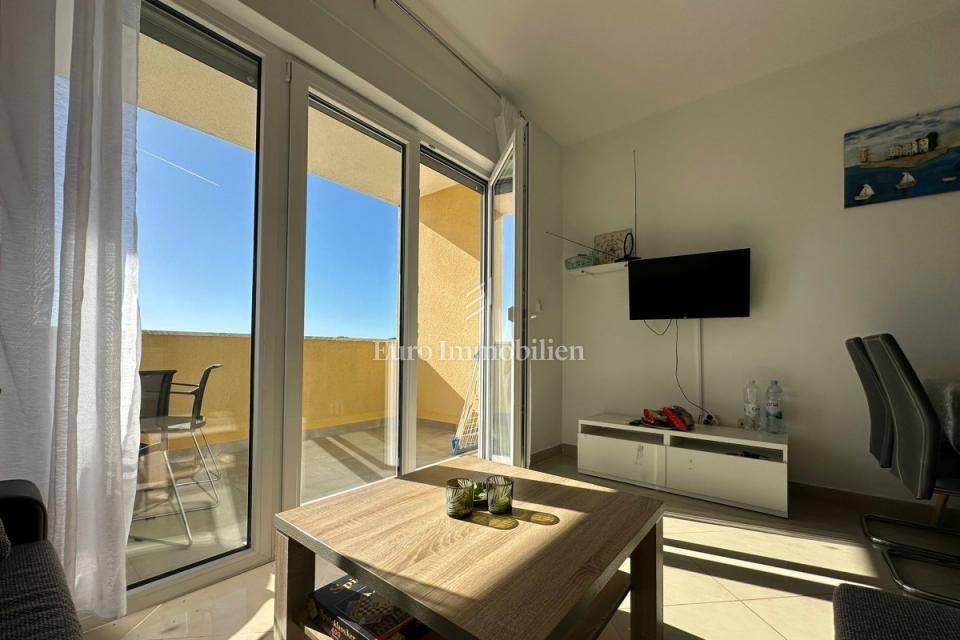 Perfectly positioned, offering an open view of the sea and the islands. It consists of an entrance hallway, two north-facing bedrooms, a bathroom, a storage room, and an open-plan kitchen and living room with access to a spacious terrace/loggia. The apartment is functional and move-in ready, fully equipped with all necessary furniture, suitable for both summer holidays and year-round living. The property includes an outdoor parking space as well as a storage room in the building’s basement.
