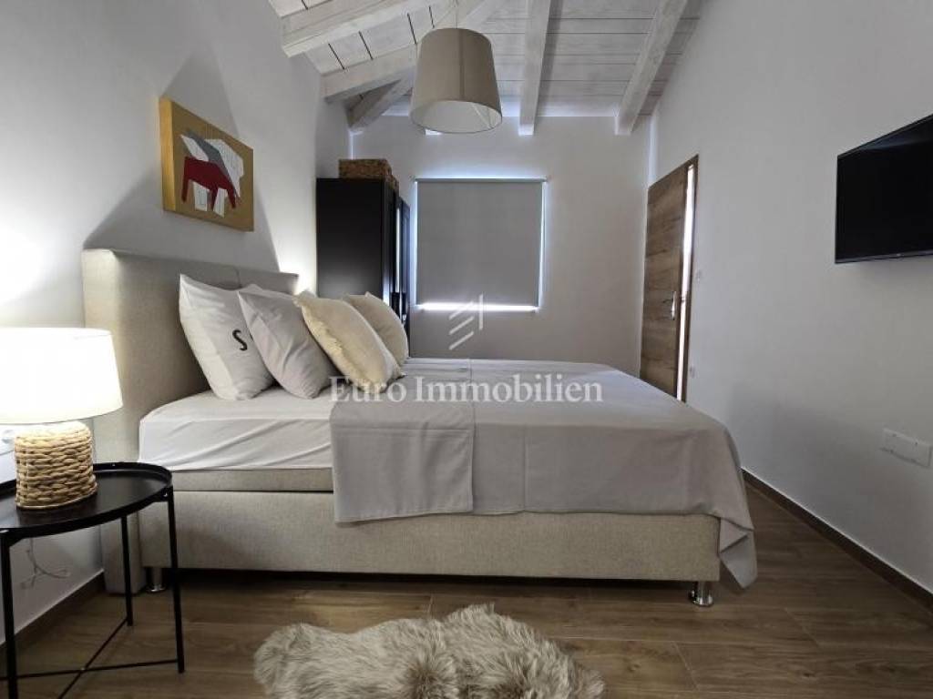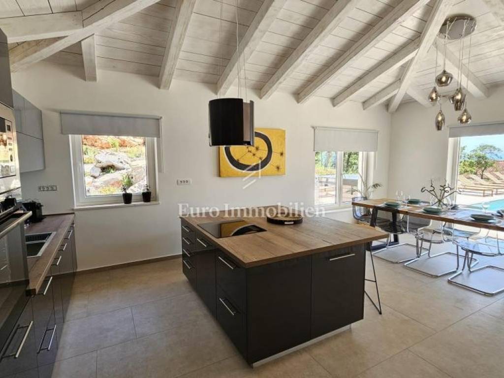 Rustic style stone villa for sale, built with Istrian stone from Kanfanar. It has an area of ​​200 m2 + 36 m2 garage + 10 m2 engine room + 35 m2 heated swimming pool with electrolysis of water and installed ceramics in the pool, while the total area of ​​the land, which is decorated with autochthonous Mediterranean plants, olive trees, natural rocks, is as much as 1,200 m2. Located in one of the most beautiful locations in Kvarner, in Jadranovo, the villa represents a perfect combination of tradition and luxury. The villa has accommodation capacity for eight people and has four bedrooms with ensuite bathrooms. On the ground floor of the villa there are two bedrooms, a spacious bright living room with an additional sofa bed for two people, and a modern kitchen with a dining room. On the upper floor there are two more bedrooms with a panoramic view of the sea. The entire space is air-conditioned, a heat pump (floor heating) and a fireplace are installed. On the stone-paved terrace there is a beautiful, ceramic-lined heated swimming pool with water electrolysis, 35 m2 in size and 1.7 m deep, and a jacuzzi (Jacuzzi) for 6 people, eight sun loungers with cushions, an outdoor dining table made of Slavonian oak, and outdoor masonry stone grill. Two parking spaces in the garage are also available in the fully fenced yard of the villa. The villa is located in an isolated location far from the city noise, and is surrounded by nature. The nearest beach is 900 m away.