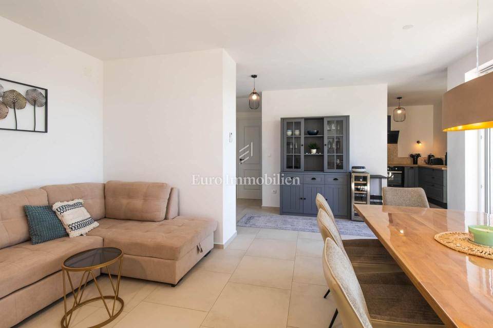 Island of Krk, Malinska area, semi-detached house for sale of 115 m2 with a garden of approximately 150 m2. The house consists of a ground floor and an upper floor. On the ground floor there is a living room with kitchen and dining area, one bedroom, bathroom and storage room. On the first floor there are three bedrooms, one of which has its own bathroom, and the other two share one bathroom. On the first floor there is also a terrace with a beautiful sea view.