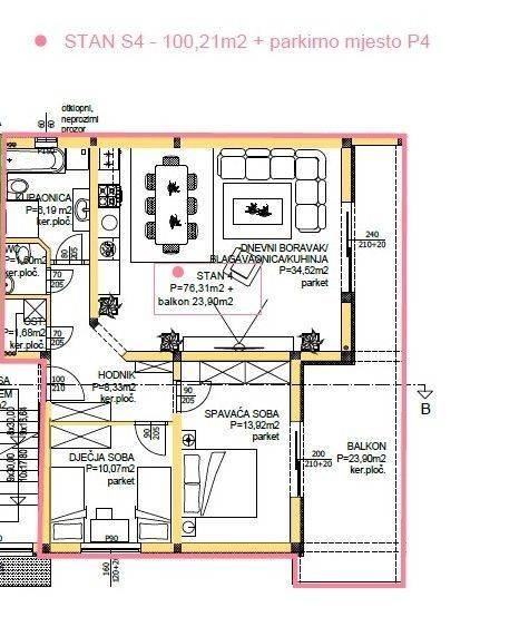 LIVING ROOM/ KITCHEN/ DINING ROOM: 34.52 m2 CORRIDOR: 8.33 m2 CHILDREN"S ROOM: 10.07 m2 BEDROOM: 13.92 m2 BATHROOM: 6.19 m2 WC: 1.60 m2 STORAGE: 1.68 m2 BALCONY: 23.90 m2The price of the apartment includes an outdoor uncovered parking space with electricity and water.