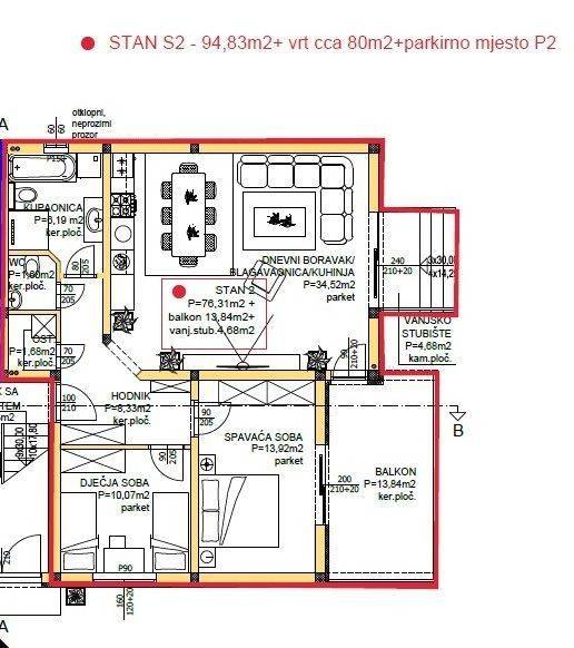 LIVING ROOM/ KITCHEN/ DINING ROOM: 34.52 m2 CORRIDOR: 8.33 m2 CHILDREN"S ROOM: 10.07 m2 BEDROOM: 13.92 m2 BATHROOM: 6.19 m2 WC: 1.60 m2 STORAGE: 1.68 m2 OUTSIDE STAIRCASE: 4.68 m2 GARDEN: approx. 80 m2The price of the apartment includes an outdoor uncovered parking space with electricity and water.