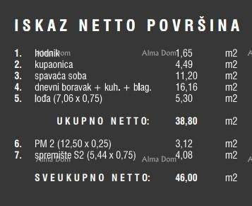 We are selling an apartment in a new residential complex in Štinjan. The complex consists of 19 two-story residential buildings. The location of the new residential complex is excellent, just one kilometer from the center of Štinjan and in close proximity to an elementary school, kindergarten, the city beach Hidrobaza, a pharmacy, and only four kilometers from the center of the city of Pula and three kilometers from the center of the village of Fažana. Access to the residential complex is provided from an asphalted surface, which will contain all the necessary infrastructure (electricity, water, sewage).The apartment labeled 15B is located on the first floor of the building and consists of: a hallway, a living room with a kitchen and dining area, a bedroom, a bathroom, and a loggia.What makes this project special is the architectural design of the facades of the residential buildings and the green roofs that appear on the facade.Each residential unit is provided with the required number of parking spaces according to the urban planning of the city of Pula. Each parking space is designed with a future connection to the electrical grid for the purpose of connecting chargers for electric vehicles.This apartment comes with a storage room and one parking space - included in the price.We are accepting reservations!For more information, please contact:Azra +385 91 611 5706 +385 98 420 885 azra@almadominvest.com