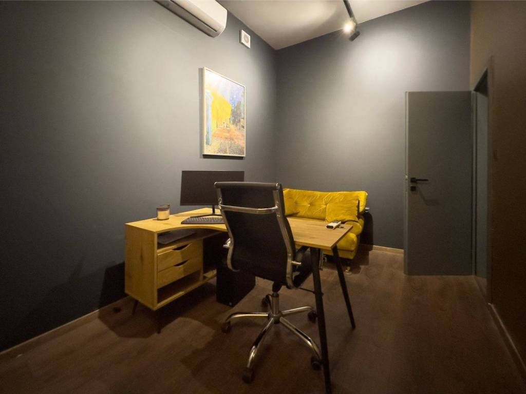 In the entrance area there is an area for customers and a reception area. In the second part, there is a work space and a separate space for meetings. From the small corridor you enter the sanitary area and the study room with a shower. The interior is decorated in a modern and functional way, and special attention was paid to the lighting, which consists of modernly designed lighting fixtures. The space is equipped with three air conditioners.