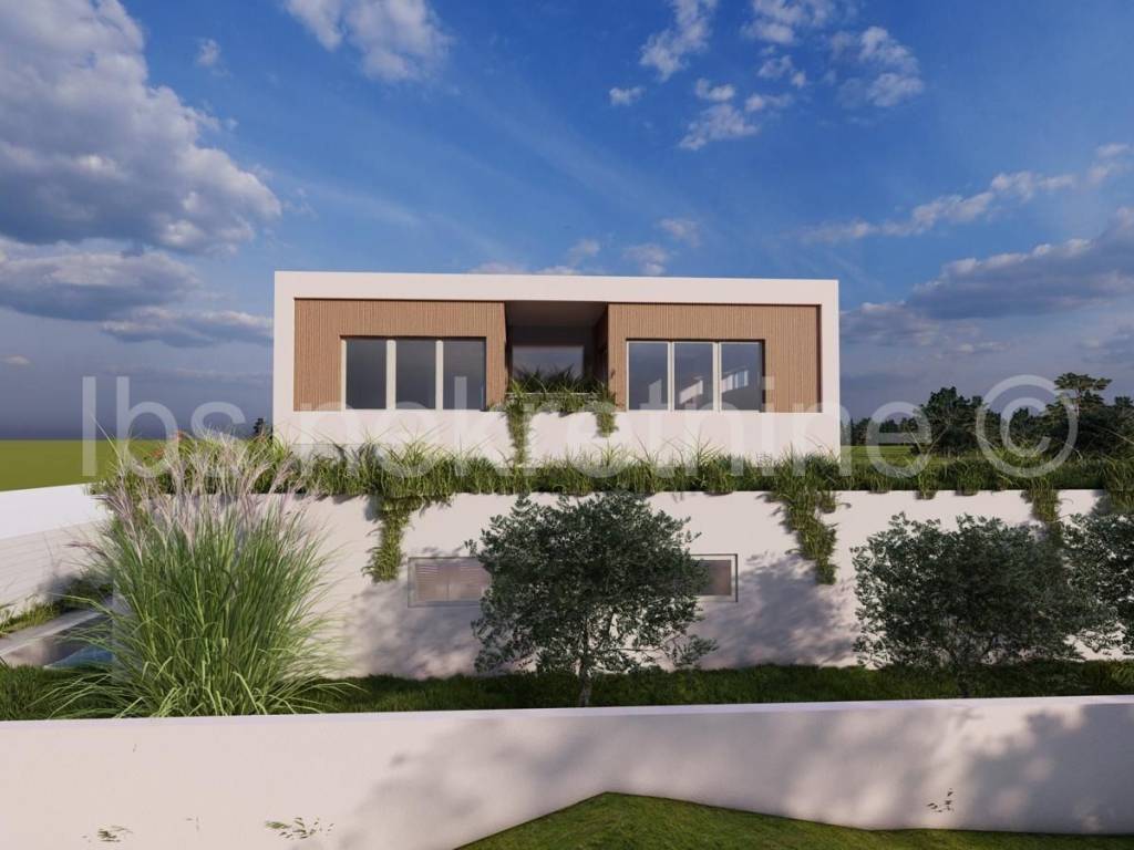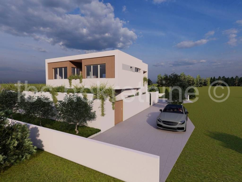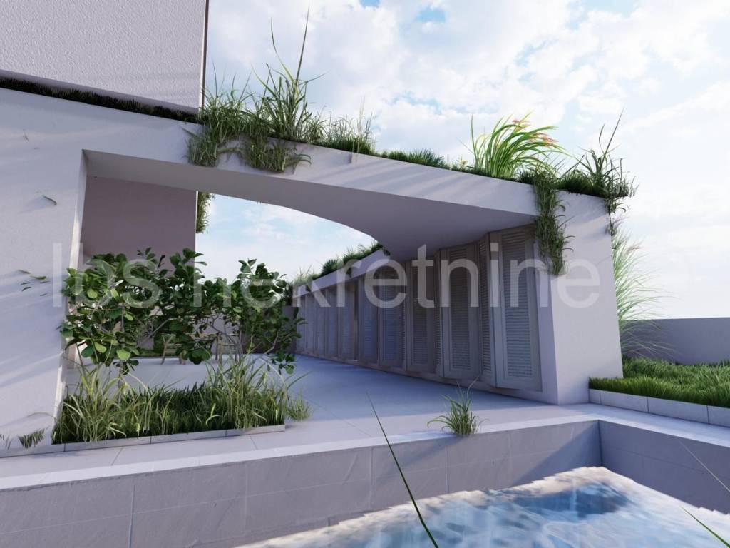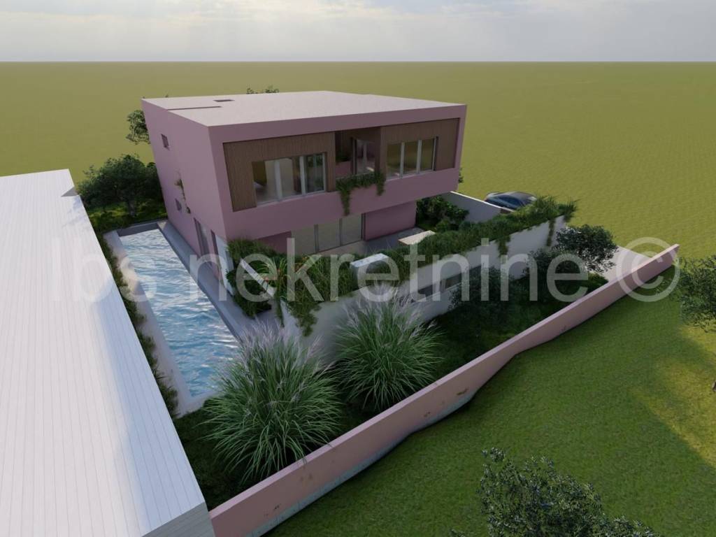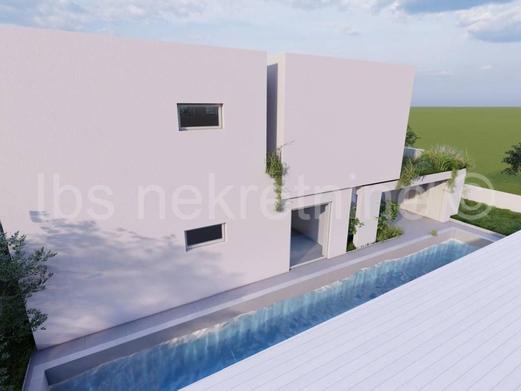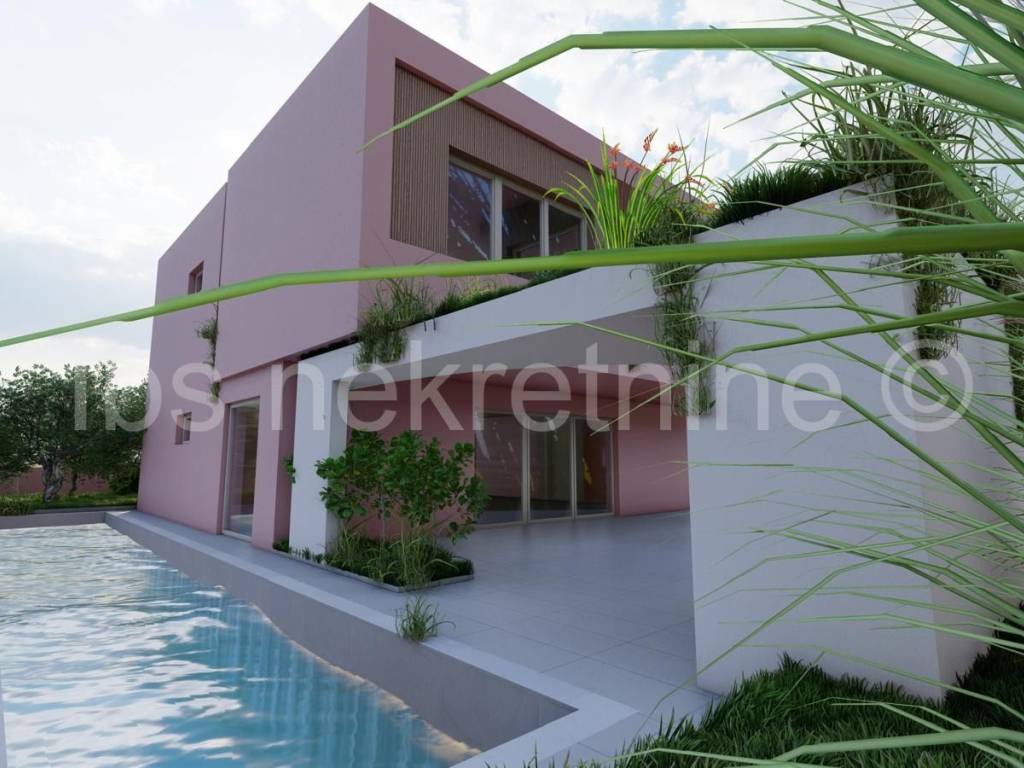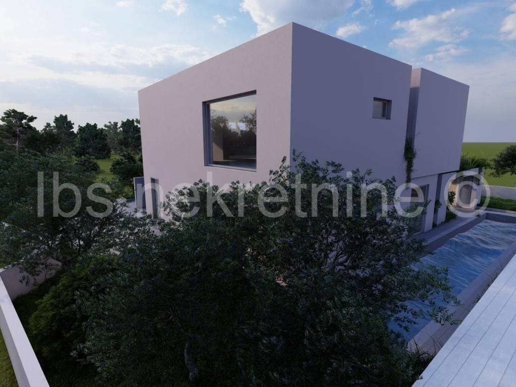Land for sale in Rogoznica with a valid building permit for a modern holiday villa, allowing the buyer to commence construction immediately. The project features a luxury residential building (ground floor + 1st floor) consisting of one spacious unit and an outdoor swimming pool, ideal for tourist rentals or a private retreat. The villa is carefully positioned on the plot to maximize views and natural light, creating a perfect atmosphere for relaxation.