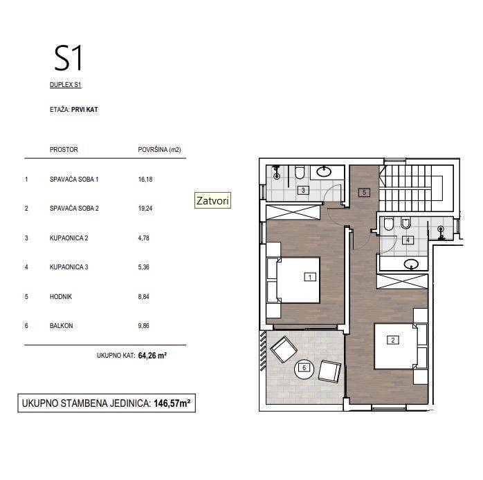 An internal staircase leads to the first floor where there are two more bedrooms, two bathrooms and a balcony that has an exit from both bedrooms, which provides privacy and comfort for the residents of the villa.