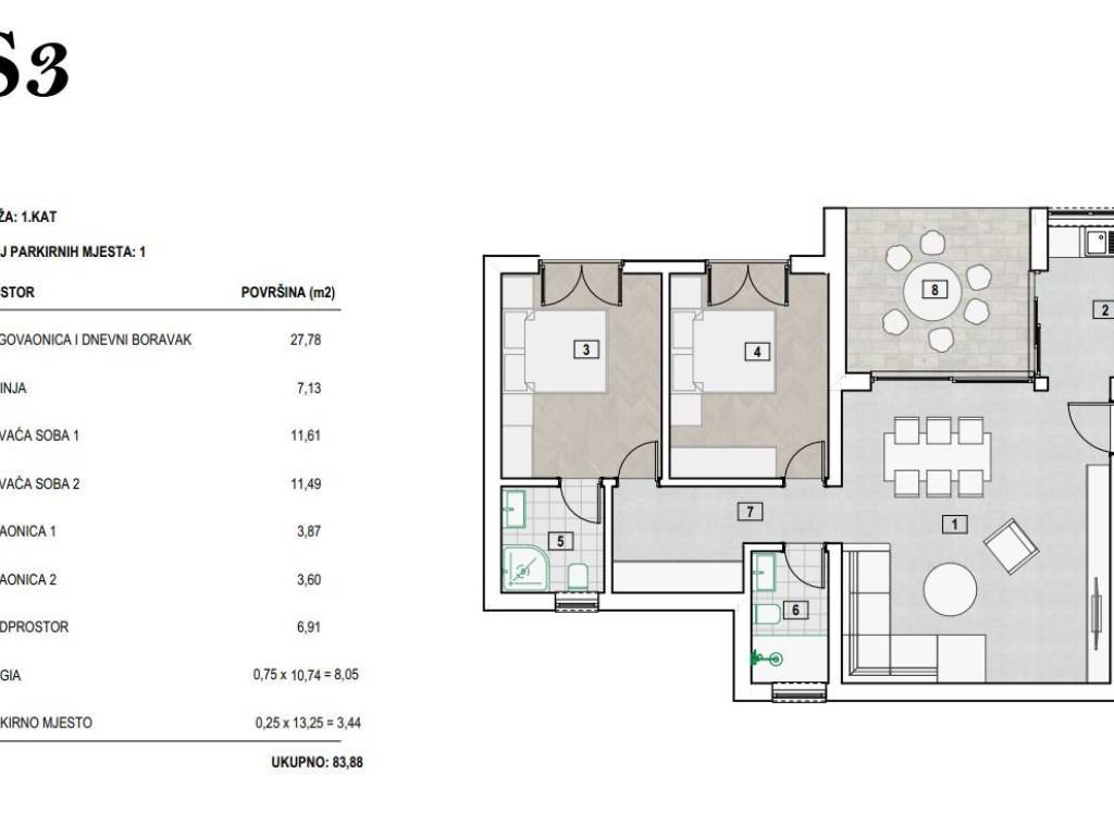 The total living area of apartment S3 on the first floor is 83.44 m2.
