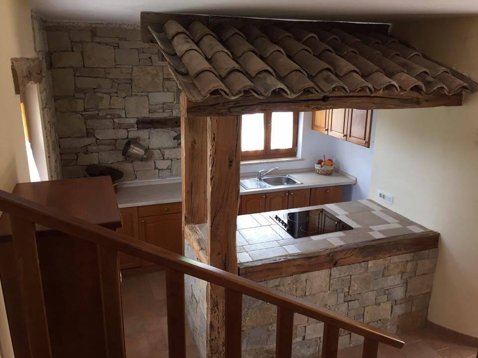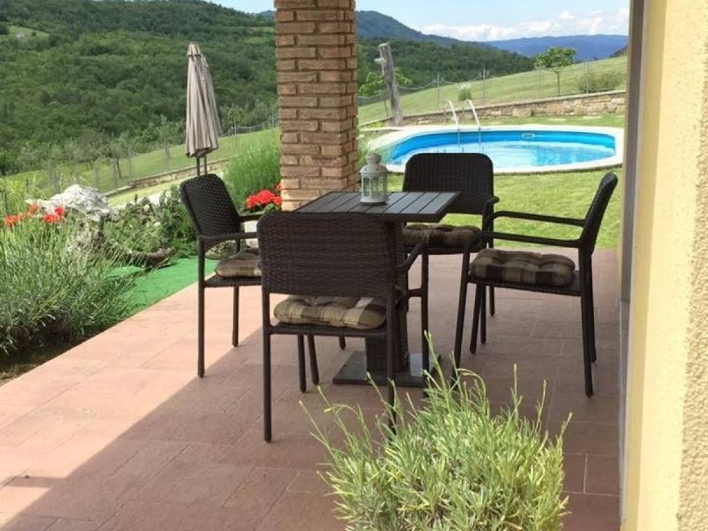 A villa with a pool is for sale located on the edge of a picturesque medieval village in the heart of the Istrian landscape. It is situated in a peaceful and quiet area, surrounded by olive groves and rural houses scattered across the local hills, offering a beautiful view of Lake Butoniga. The villa is rustic in design, using local, natural materials and traditional techniques, with most of the furniture being unique and handmade.The villa has been valorized for tourism and offers accommodation in two residential units. The first unit consists of a spacious living room with a fireplace, a fully equipped kitchen, a dining room, and a bathroom on the ground floor, two bedrooms, and a spacious bathroom with a Jacuzzi bathtub and shower cabin on the first floor.