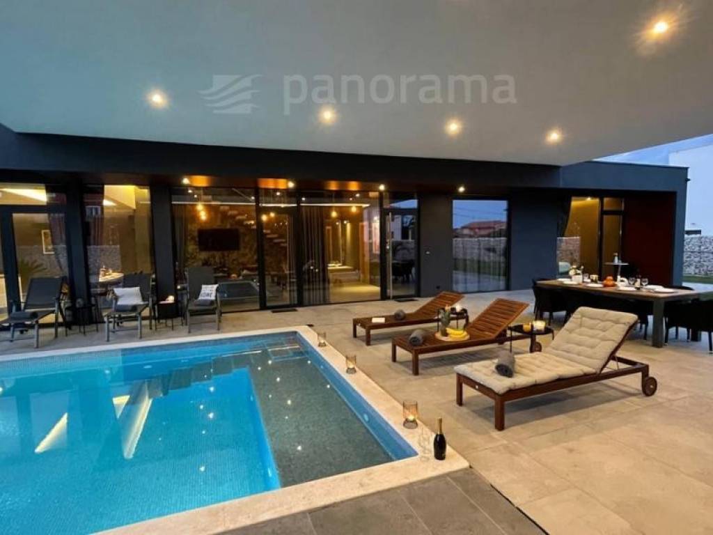 On the ground floor of the villa there is an open space living room with kitchen and dining room, and a space for leisure, all with access to an impressive covered terrace, and 1 bedroom with bathroom and toilet. Upstairs there are 3 more bedrooms with their own bathrooms and access to the terrace with a beautiful view of the sea and the bay. The rooms are larger than average, with glass walls from floor to ceiling, designed and furnished. In the interior, the interior entrance lobby with a height of 7.5 meters, surrounded by airy stairs leading to the first floor, stands out. The proximity of the pool itself to the interior is particularly attractive - tucked under the upper floor, at a distance of only 5 meters from the living room and dining room.