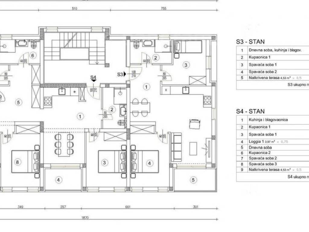 The apartment marked S3 is located on the 1st floor and has 55m2 and consists of a living room, kitchen and dining room, 2 bedrooms, bathroom and terrace.