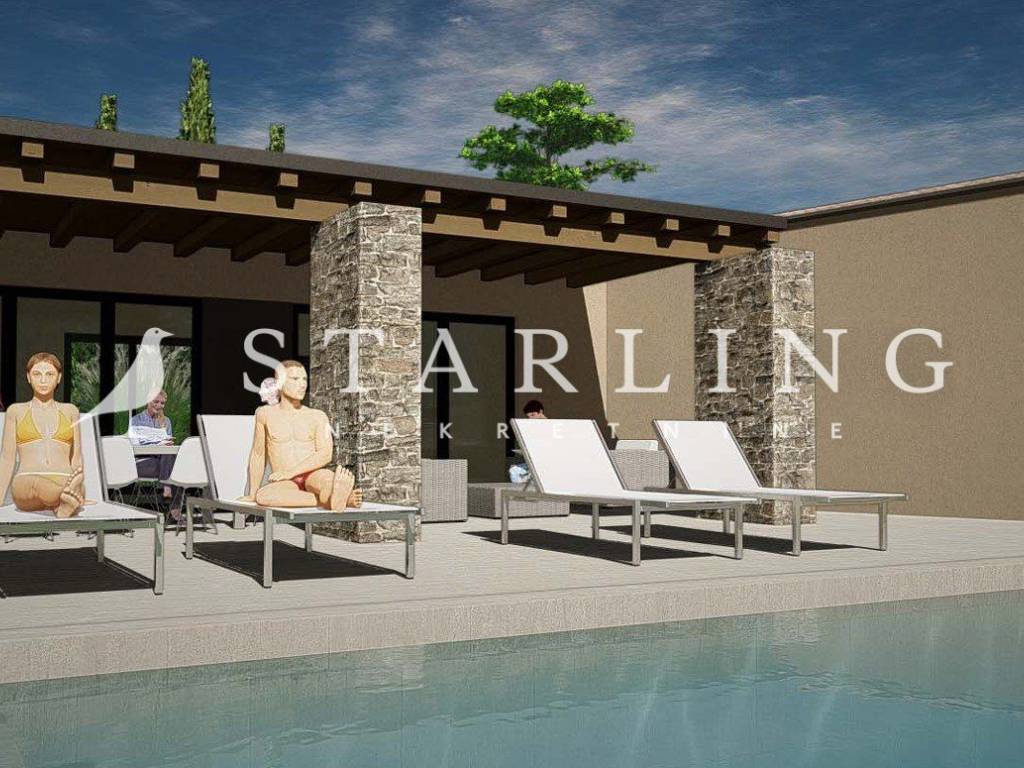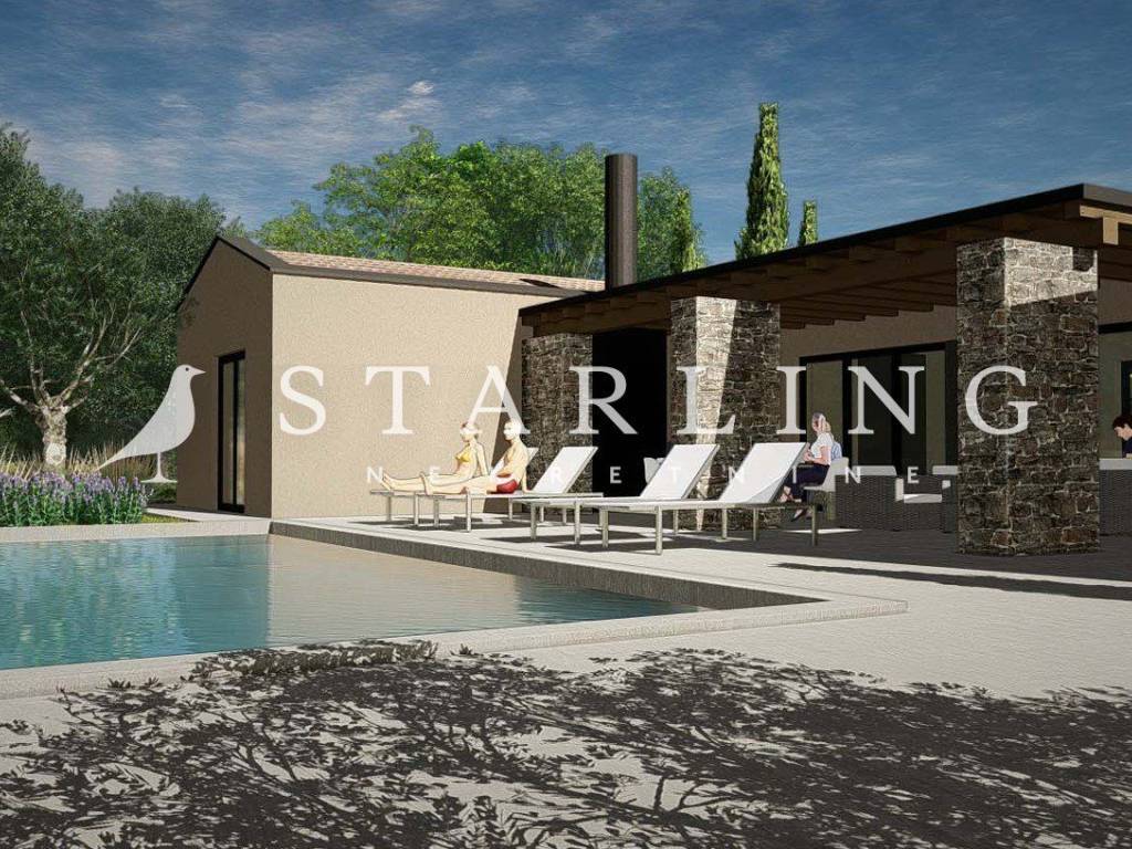 The planned house combines modern architecture with traditional Mediterranean style, using natural materials such as stone, wood, and concrete. Clean lines and generous glazing connect the interior with the surrounding landscape. All rooms enjoy open views of nature and the planned swimming pool, while outdoor terraces extend the living areas directly into the environment.