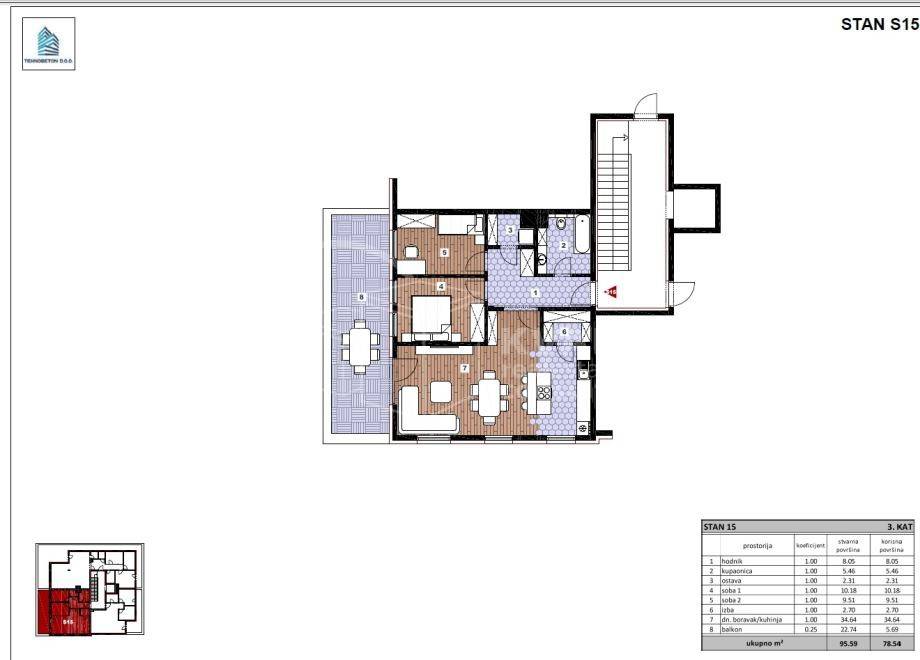 Ukupna stvarna površina stana iznosi 95,59 m2, dok obračunska površina iznosi 78,54 m2.