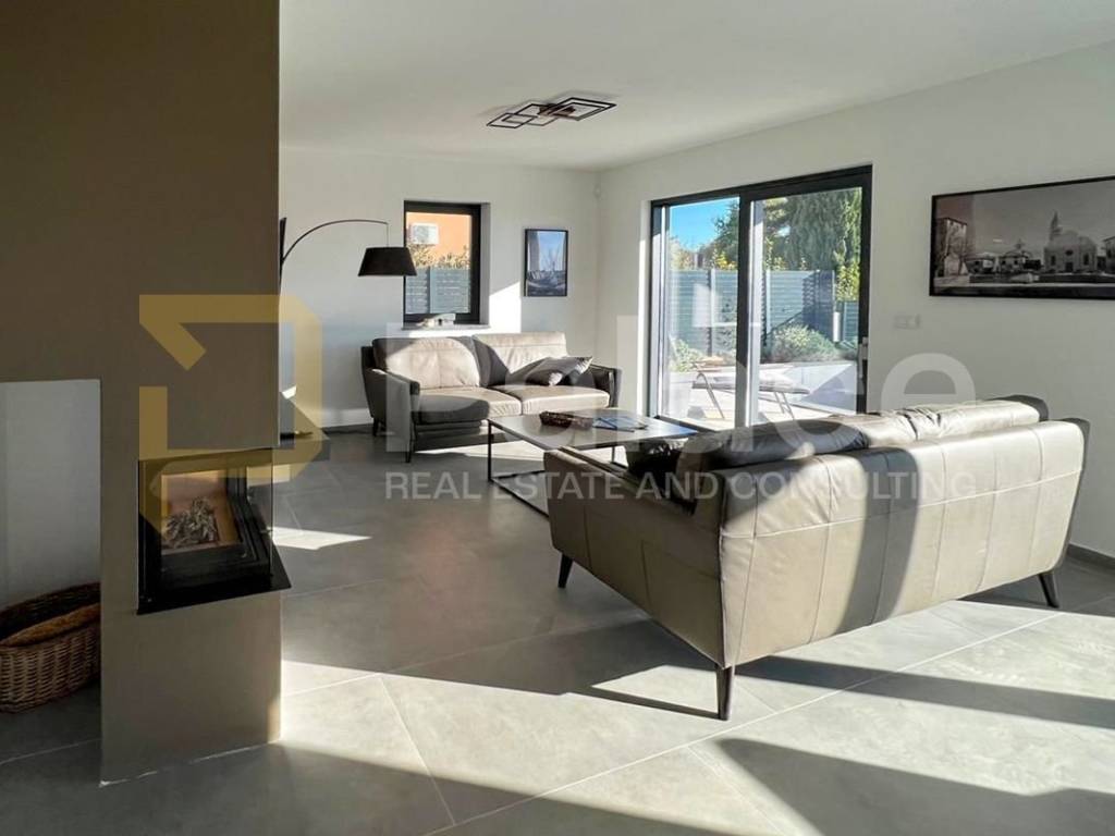 The ground floor is open, airy, and functional, with a spacious living room, dining area, and fully equipped kitchen, perfect for family gatherings and social events. Heating is provided through a heat pump, and the entire house has underfloor heating and cooling with fan coil units, ensuring optimal temperature throughout the year. There is also a technical room that allows optimal management of all home systems. All windows and doors are equipped with ALU K triple-glazed joinery, ensuring high energy efficiency and sound insulation, making the villa energy-efficient and comfortable to live in.