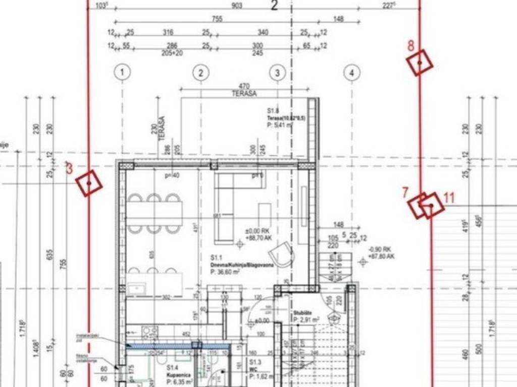 Ukupna kvadratura stana iznosi 97,83 m2, a sastoji se od prostranog dnevnog boravka s blagovaonicom i kuhinjom površine 36,60 m2, spavaće sobe 13,30 m2, dječje sobe 10,32 m2, ureda ili moguće druge dječje sobe 8,00 m2, kupaonice 6,35 m2, toaleta 1,62 m2, hodnika 10,82 m2 te terase 10,82 m2.