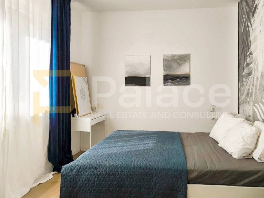 The apartment consists of a large open-plan space that combines the kitchen, dining area, and living room, with access to a balcony. It features three comfortable bedrooms and two modern bathrooms. Each room, including the living room, is equipped with air conditioning, ensuring a comfortable temperature year-round. The living room also includes a wood-burning fireplace, creating a special ambiance during the winter months.