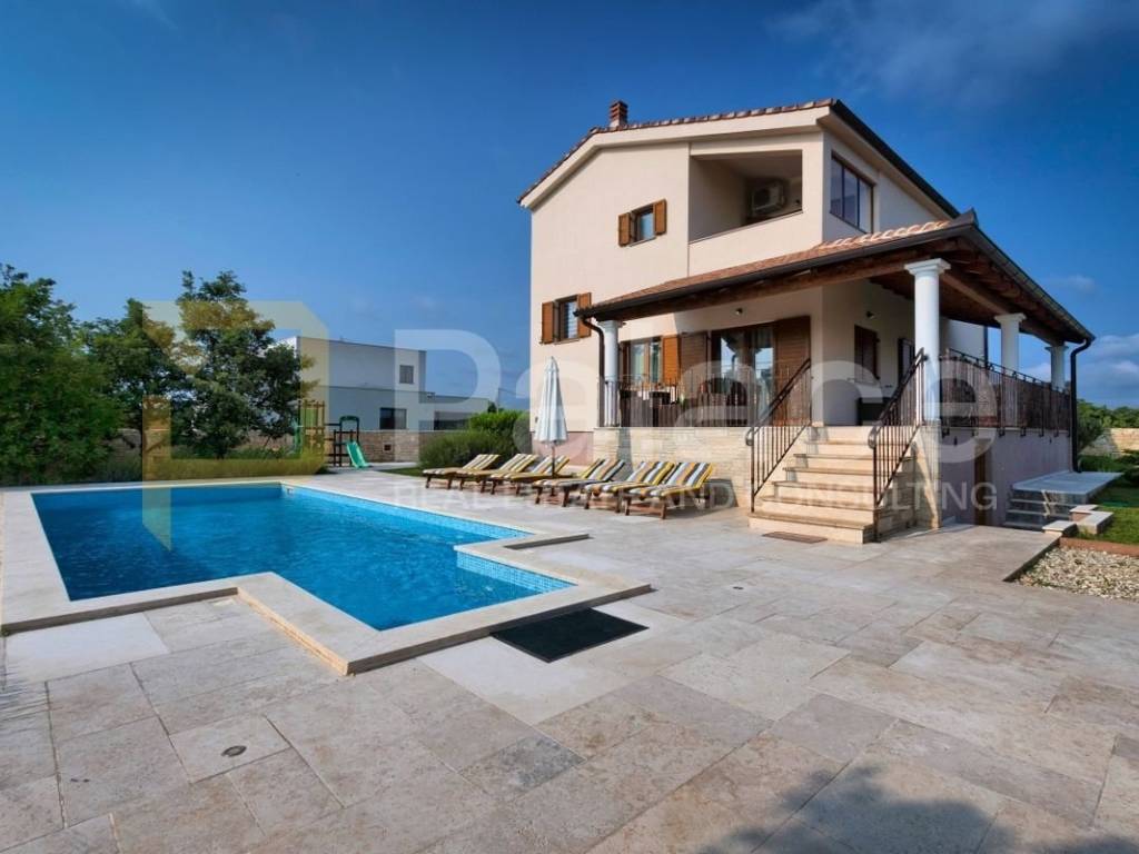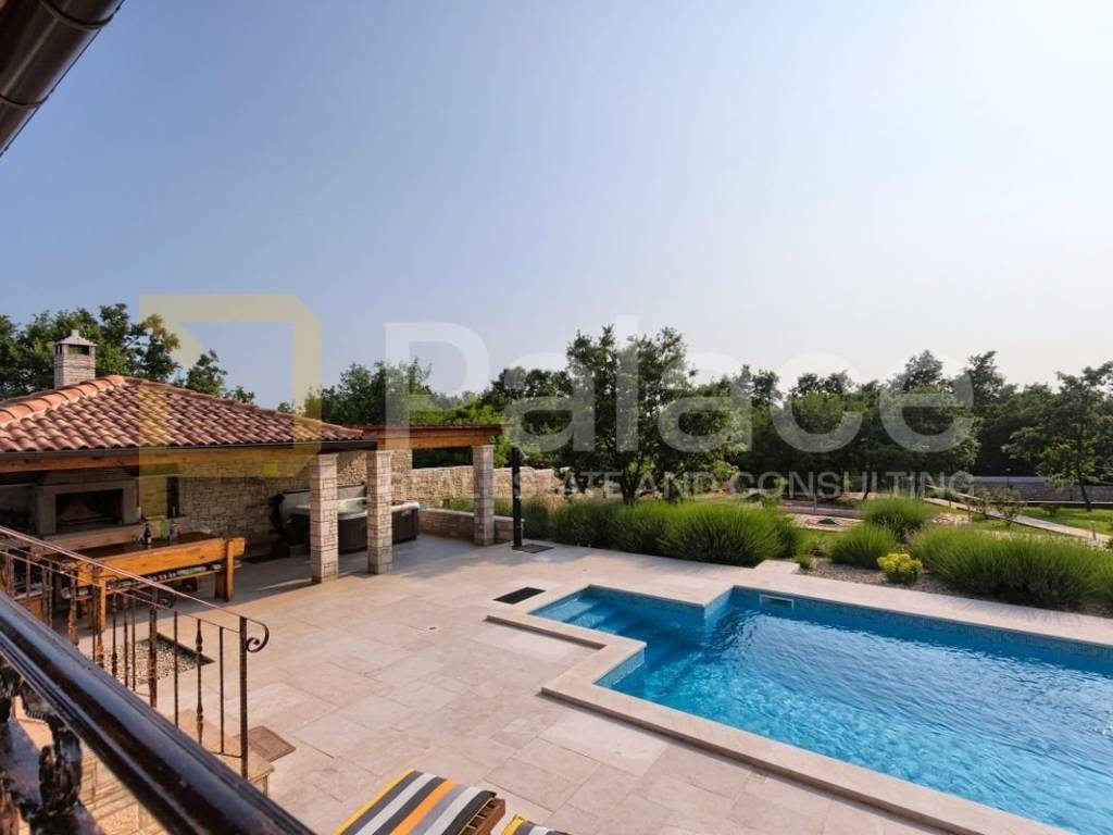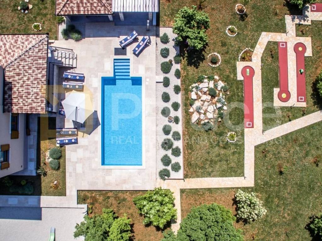 The exterior of the villa includes a heated pool of 36 m², a spacious terrace of 100 m², a covered barbecue fireplace with seating area, parking for four vehicles, a children"s playground, and mini golf. For sports enthusiasts, there is also a multifunctional court (16x8m) for small football, basketball, and volleyball, and an additional feature includes a jacuzzi for 6 people.