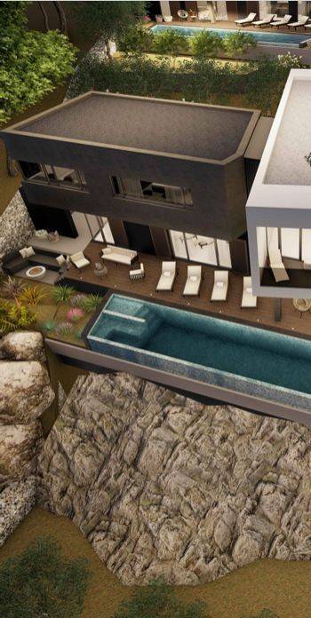 In the elevated part of Seget Donji, there is a plot of land on which a luxury villa complex will be built. The complex will consist of 5 villas built in a cascading design concept, allowing for an open view towards Trogir, Seget, Okrug, the sea, and the islands.
