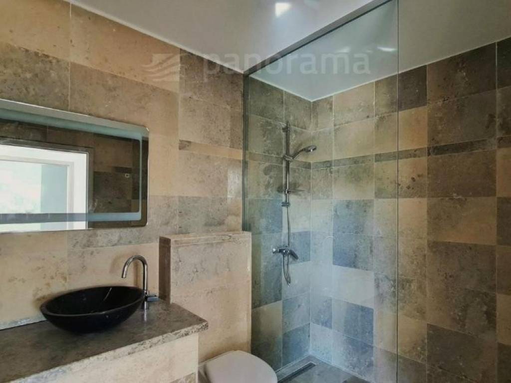 The villa has an area of 200 m2 and extends through the ground floor and first floor. On the ground floor there is a fully equipped kitchen and dining room with a view of the sunbathing area and pool. On the ground floor there are three bedrooms, each with its own bathroom, furnished with quality stone. On the ground floor there is also a guest toilet and storage room. On the first floor there is a spacious living room, a bedroom with its own bathroom and another guest toilet.