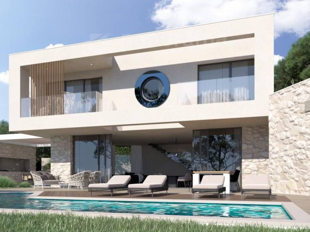 This imposing villa with a swimming pool is being built in a small, idyllic place in eastern Istria. In addition to its unique design and quality, you will also be delighted by the open sea view from every room of this property.