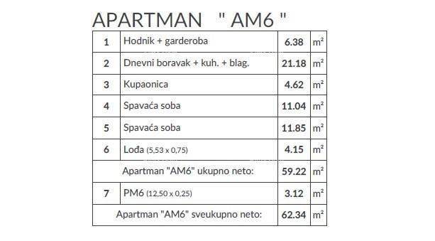 New residential project with 8 residential units, located in a prime location in Volme.Apartment AM6- is located on the 1st floor of the building and consists of: hallway + wardrobe, bathroom, 2 bedrooms, living room with kitchen and dining room and loggia.The apartment has a parking space PM6 which is included in the price.Apartment specifications:Exterior joinery - PVC with triple glazing and aluminum roller shutters with electric motor, facade - demit on the first floor 12 cm thick, on the ground floor 8 cm plus 2 cm Travertino bianco stone, cooling and heating - Mitsubishi air conditioners and electric underfloor heating in all rooms with wi-fi thermostats, final floor coverings - Marca Corona ceramic tiles.Interior designs are made for each apartment separately.For additional information, please contact:Azra+385 91 611 5706+385 98 420 885azra@almadominvest.com