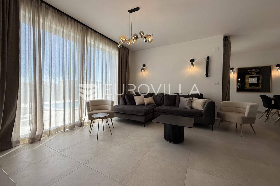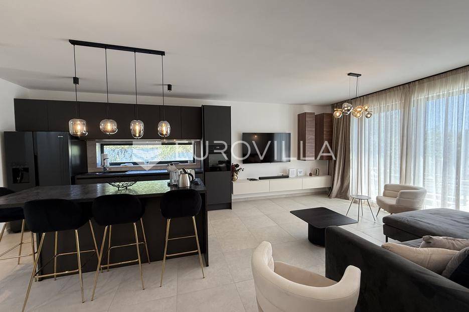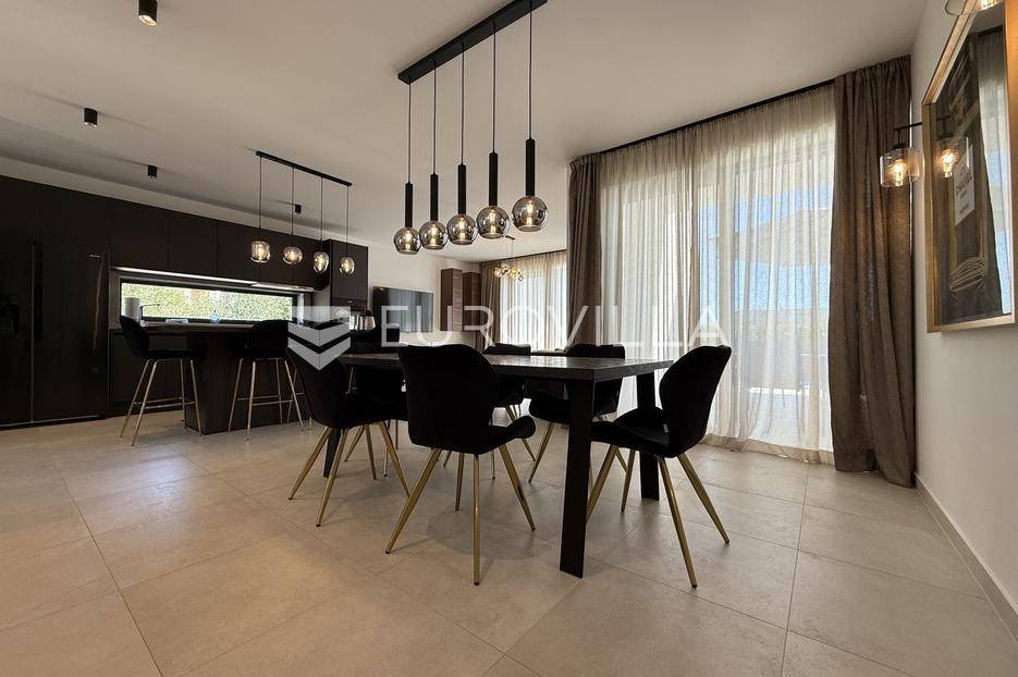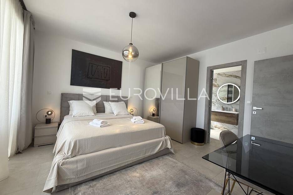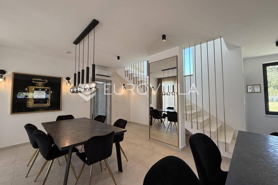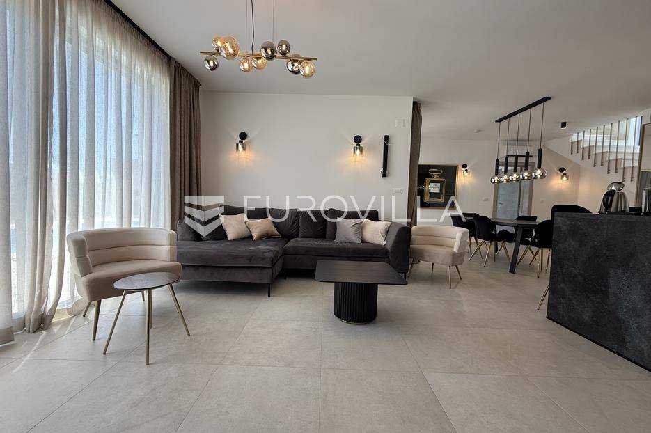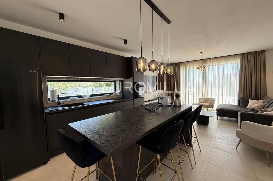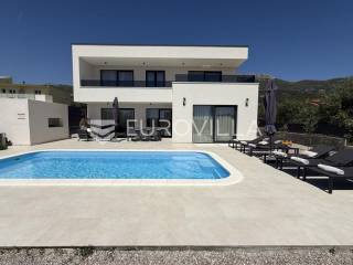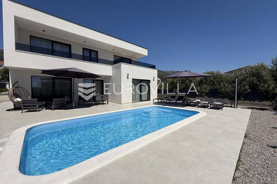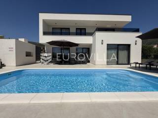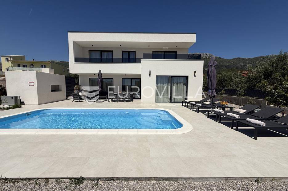 Kaštel Stari, moderna vila s bazenom na prostranoj parceli površine 938 m2 s pogledom na more.Netom dovršena vila stambene površine 245 m2 proteže se na dvije etaže. Prizemlje se sastoji od ulaza, gostinjske kupaonice i praonice, spavaće sobe s en suite kupaonicom te otvorenog koncepta kuhinje, blagovaonice i dnevnog boravka s izlazom na terasu s bazenom, sunčalištem i vrtom.Unutarnje stubište vodi na kat gdje su još dvije spavaće sobe s kupaonicama i izlazom na balkone te spremište.Kuća je opremljena dizajnerskim namještajem, sagrađena po najboljim ekološkim standardima i posjeduje A++ energetski certifikat. Na zemljištu je moguća gradnja dodatnog objekta tlocrtne površine 50 m2.Kuća se prodaje potpuno namještena.Nalazi se u blizini svih sadržaja potrebnih za miran obiteljski život, a ujedno je nekretnina idealna kao investicija u turizmu.Više informacija na upit.