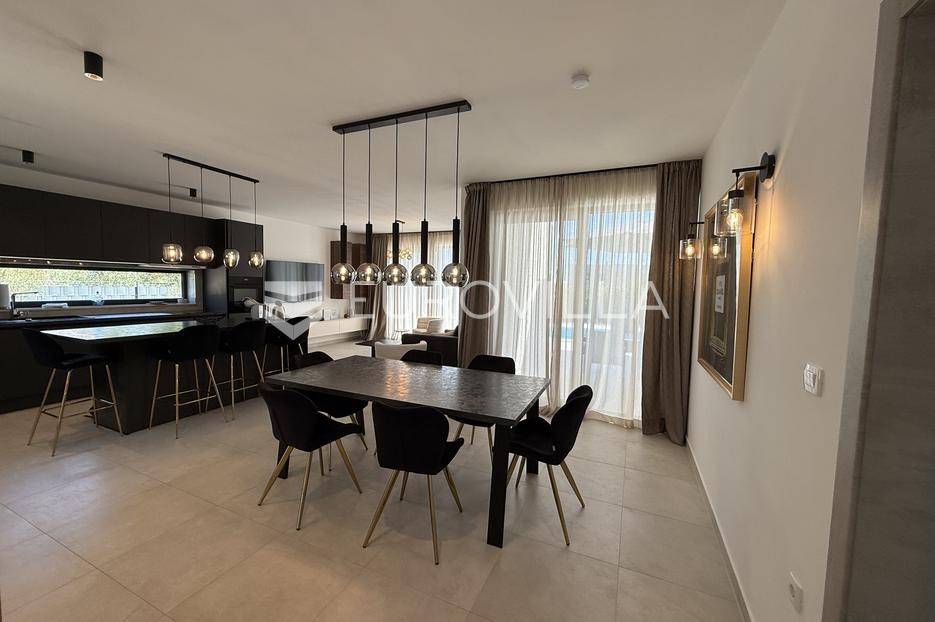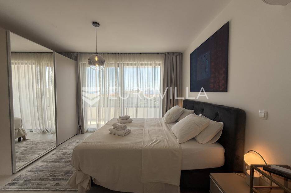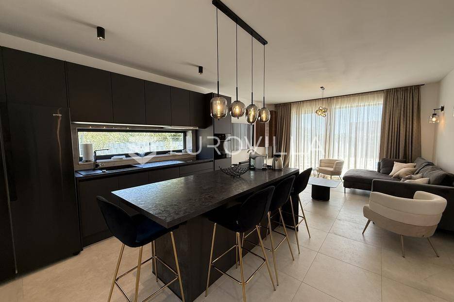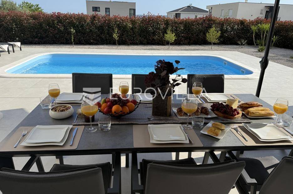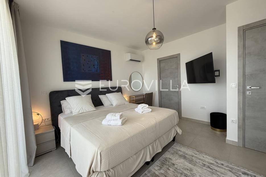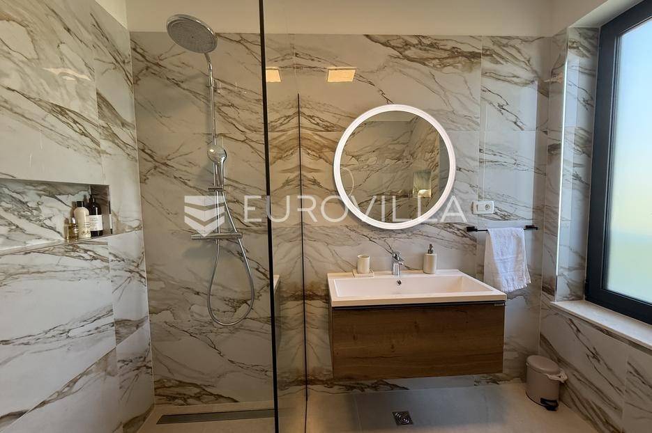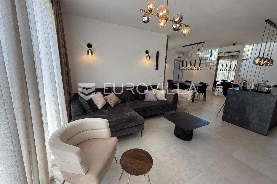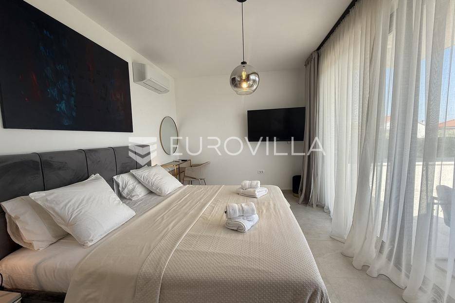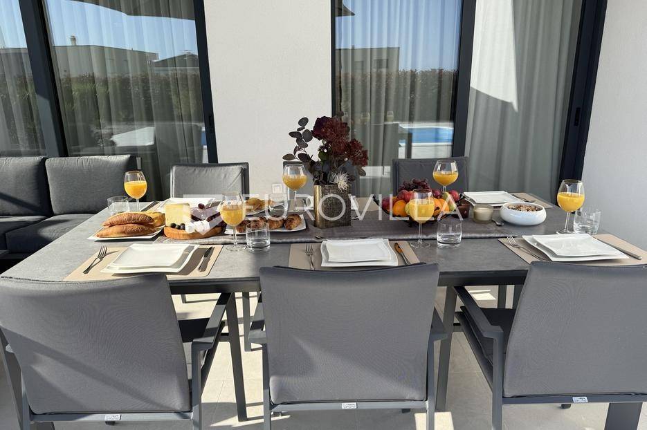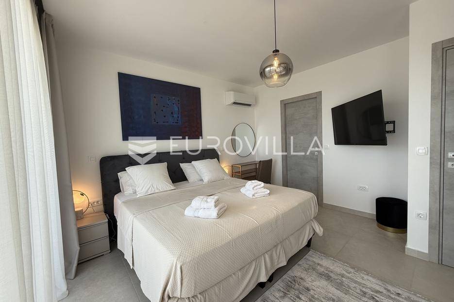 Kaštel Stari, moderna vila s bazenom na prostranoj parceli površine 938 m2 s pogledom na more.Netom dovršena vila stambene površine 245 m2 proteže se na dvije etaže. Prizemlje se sastoji od ulaza, gostinjske kupaonice i praonice, spavaće sobe s en suite kupaonicom te otvorenog koncepta kuhinje, blagovaonice i dnevnog boravka s izlazom na terasu s bazenom, sunčalištem i vrtom.Unutarnje stubište vodi na kat gdje su još dvije spavaće sobe s kupaonicama i izlazom na balkone te spremište.Kuća je opremljena dizajnerskim namještajem, sagrađena po najboljim ekološkim standardima i posjeduje A++ energetski certifikat. Na zemljištu je moguća gradnja dodatnog objekta tlocrtne površine 50 m2.Kuća se prodaje potpuno namještena.Nalazi se u blizini svih sadržaja potrebnih za miran obiteljski život, a ujedno je nekretnina idealna kao investicija u turizmu.Više informacija na upit.