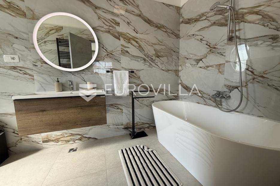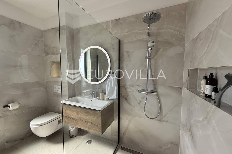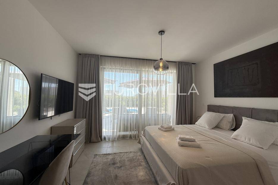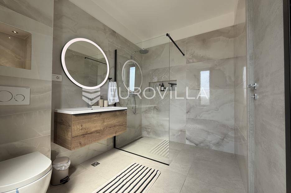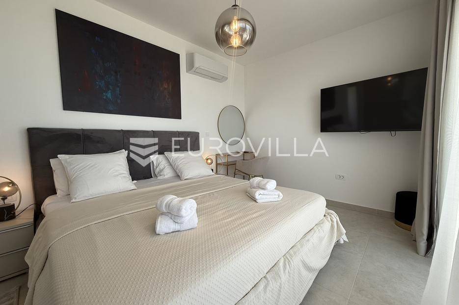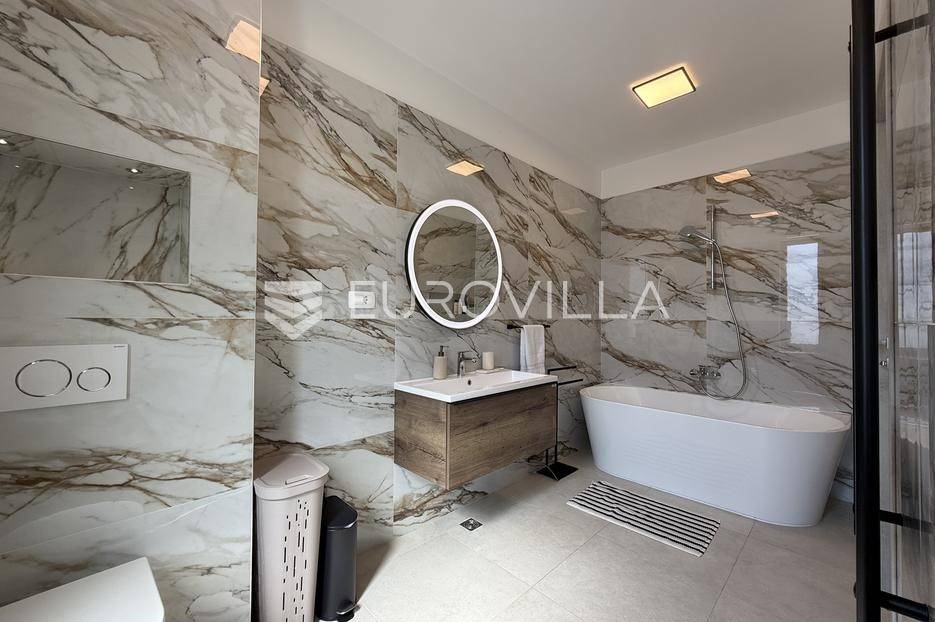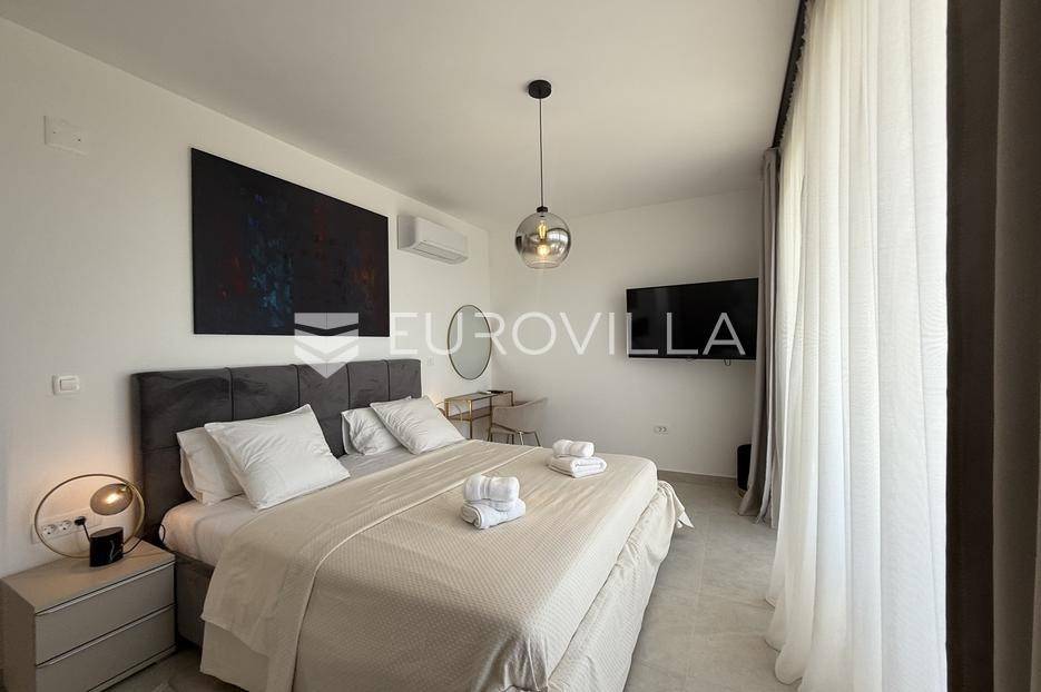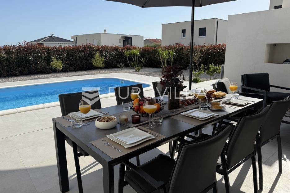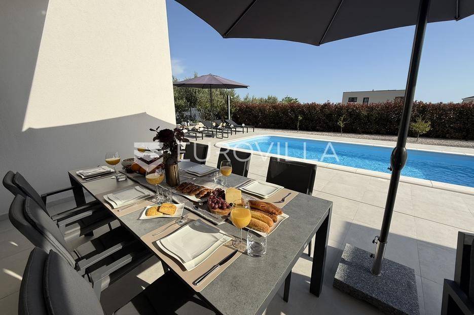 Kaštel Stari, moderna vila s bazenom na prostranoj parceli površine 938 m2 s pogledom na more.Netom dovršena vila stambene površine 245 m2 proteže se na dvije etaže. Prizemlje se sastoji od ulaza, gostinjske kupaonice i praonice, spavaće sobe s en suite kupaonicom te otvorenog koncepta kuhinje, blagovaonice i dnevnog boravka s izlazom na terasu s bazenom, sunčalištem i vrtom.Unutarnje stubište vodi na kat gdje su još dvije spavaće sobe s kupaonicama i izlazom na balkone te spremište.Kuća je opremljena dizajnerskim namještajem, sagrađena po najboljim ekološkim standardima i posjeduje A++ energetski certifikat. Na zemljištu je moguća gradnja dodatnog objekta tlocrtne površine 50 m2.Kuća se prodaje potpuno namještena.Nalazi se u blizini svih sadržaja potrebnih za miran obiteljski život, a ujedno je nekretnina idealna kao investicija u turizmu.Više informacija na upit.