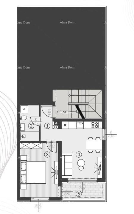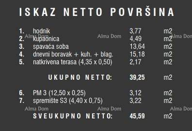 We are selling an apartment in a new residential complex in Štinjani. The complex consists of 19 two-story residential buildings. The location of this new residential complex is excellent, just one kilometer from the center of Štinjani and in close proximity to an elementary school, kindergarten, the city beach Hidrobaza, a pharmacy, and only four kilometers from the center of the city of Pula and three kilometers from the center of the village of Fažana. Access to the residential complex is provided from an asphalted surface, which will include all necessary infrastructure (electricity, water, sewage).The apartment labeled 9C is located on the first floor of the building and consists of: a hallway, a living room with a kitchen and dining area, a bedroom, a bathroom, and a terrace.What makes this project special is the architectural design of the facades of the residential buildings, as well as the green roofs that appear on the facades.Each residential unit is ensured the required number of parking spaces according to the urban plan of the city of Pula, measuring 2.50m x 5.00m. Each parking space is designed with a future connection to the electrical grid for the purpose of connecting chargers for electric vehicles.This apartment comes with a storage room and one parking space - included in the price.We are accepting reservations!For more information, please contact:Azra  +385 91 611 5706  +385 98 420 885  azra@almadominvest.com