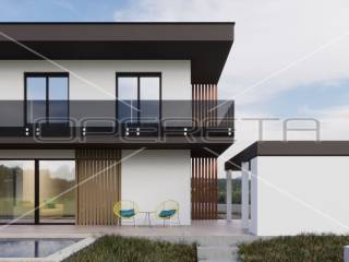 The yard is completed with a 36 m2 swimming pool, a covered terrace, and an auxiliary building, also covered and designed as a summer kitchen. The remaining environment will be enriched with Mediterranean plants, a meadow, and parking for 3 cars.