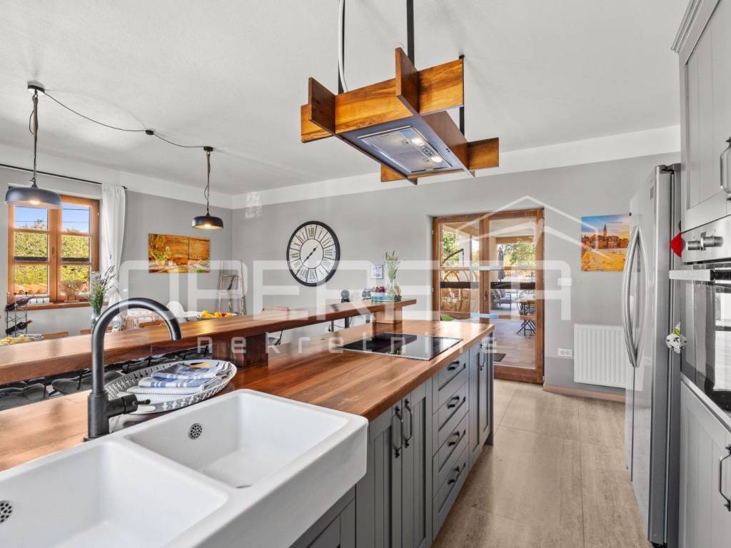 In the extension of the spacious covered terrace, there is a summer kitchen with a socializing area. Furthermore, there is an outdoor toilet and an additional bedroom with its own entrance and bathroom.