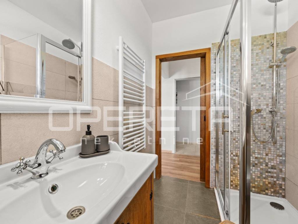 On the ground floor of the villa there is a hallway, a particularly spacious kitchen with a dining room and access to a covered terrace, a spacious living room with a fireplace for additional comfort in winter days, also from the living room there is access to the terrace and the swimming pool sundeck, a bedroom with its own bathroom, and a storage room where the house heating system is located on the principle of a central wood-burning stove that heats the entire house. The first phase of underfloor heating is installed on the first floor.