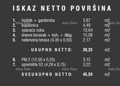 We are selling an apartment in a new residential complex in Štinjani. The complex consists of 19 two-story residential buildings. The location of the new residential complex is excellent, just one kilometer from the center of Štinjani and in close proximity to an elementary school, kindergarten, the city beach Hidrobaza, a pharmacy, and only four kilometers from the center of the city of Pula and three kilometers from the center of the village of Fažana. Access to the residential complex is provided from an asphalted road, within which all necessary infrastructure (electricity, water, sewage) will be located.The apartment labeled 9B is located on the first floor of the building and consists of: a hallway, a living room with a kitchen and dining area, a bedroom, a bathroom, and a terrace.What makes this project special is the architectural design of the facade of the residential buildings and the green roofs that appear on the facade.Each residential unit is guaranteed the required number of parking spaces according to the urban plan of the city of Pula, measuring 2.50m x 5.00m. Each parking space is designed to include a future connection to the power grid for the purpose of connecting electric vehicle chargers.This apartment comes with 1 parking space and a storage room, which are included in the price.We are accepting reservations!For more information, please contact:Azra  +385 91 611 5706  +385 98 420 885  azra@almadominvest.com
