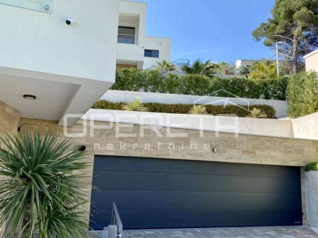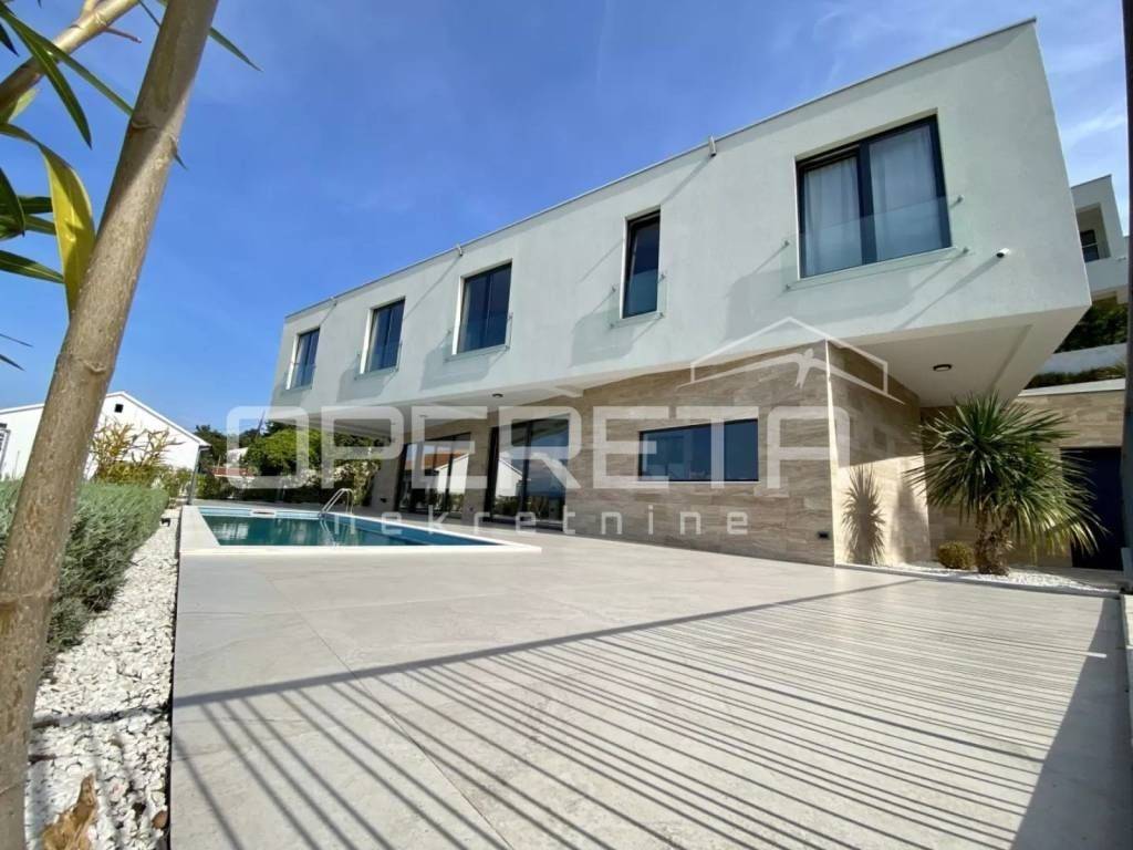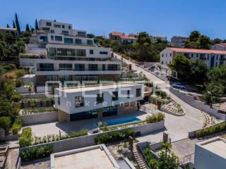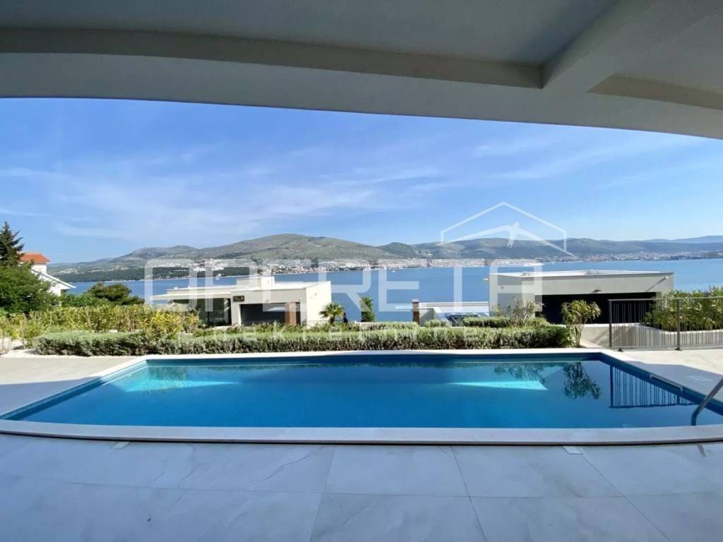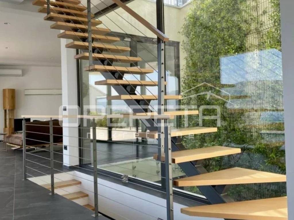 The ground floor consists of a spacious living room with a kitchen and dining area, as well as one bathroom. The ground floor leads to a terrace featuring a heated pool with a sea view.