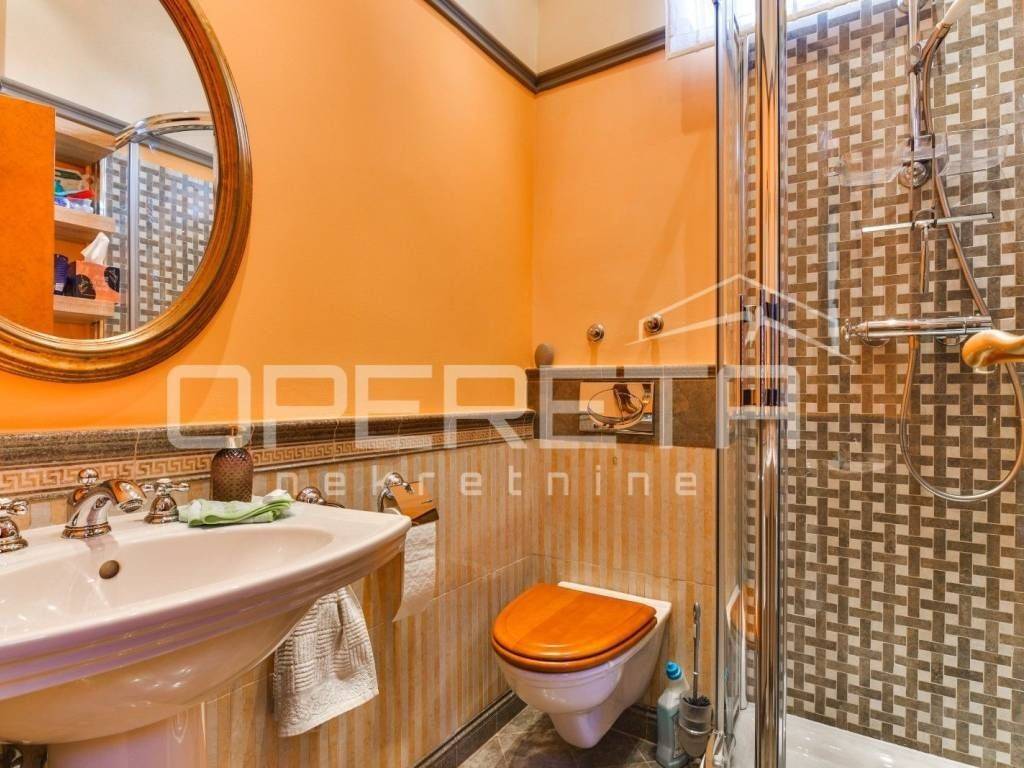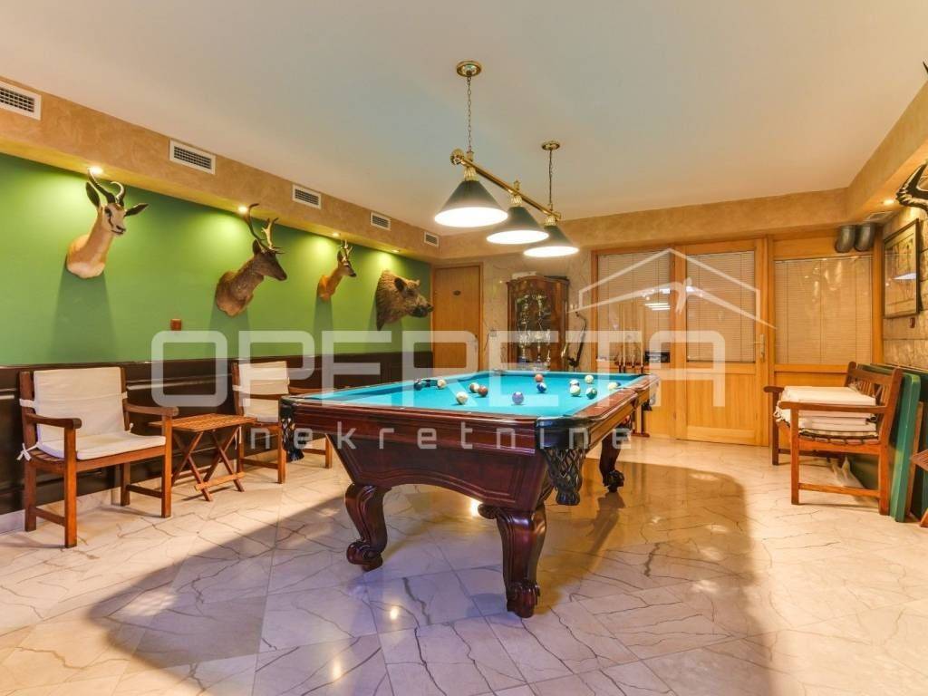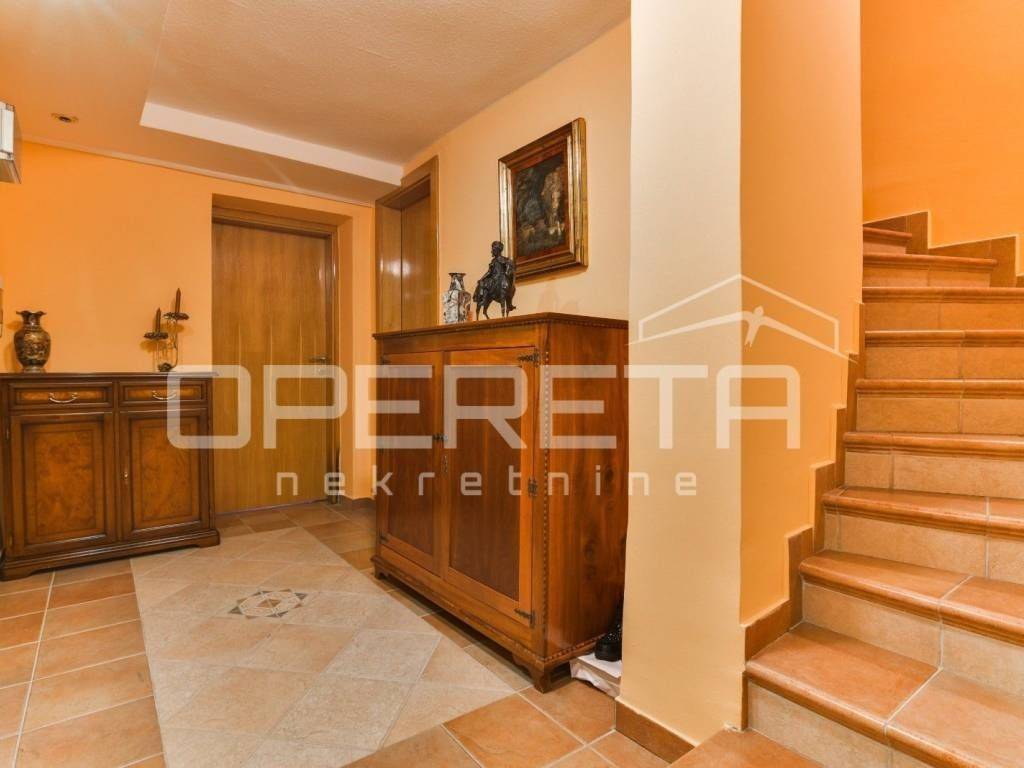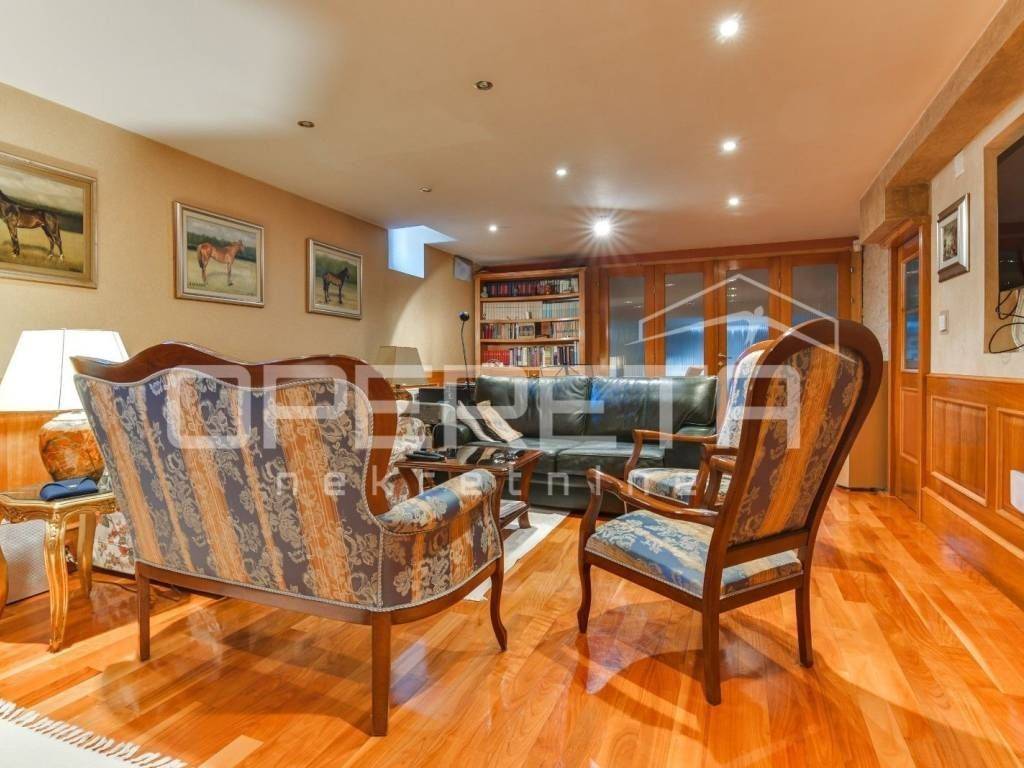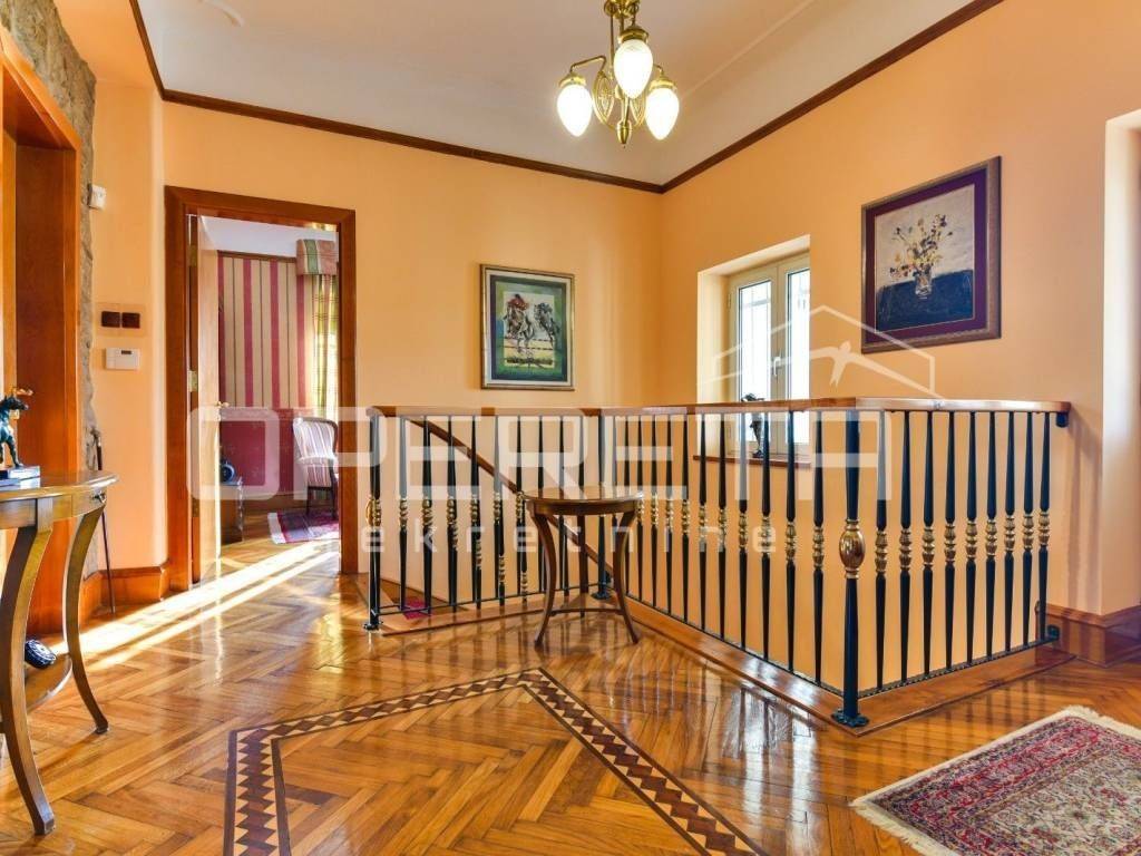 Prije 20 godina temeljito obnovljena i preuređena. Ukupna neto površina 325 m2, 3 etaže, na katu su 3 sobe i kupaona, u prizemlju salon i kuhinja te wc za goste, u podrumu mala garsonjera za poslugu, kino sala, biljar sala, lovačka soba, sauna i trim kabinet. Kuća ima garažu za 2 vozila, vinski podrum, vrt i veoma veliku natkrivenu terasu,