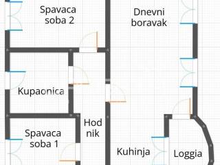 On the high ground floor of a residential building built in 2006, there is an apartment with an excellent layout with a total area of 63.45 m2. The building has a total of two floors, and the apartment consists of two bedrooms, a kitchen, a living room, a bathroom and a loggia.