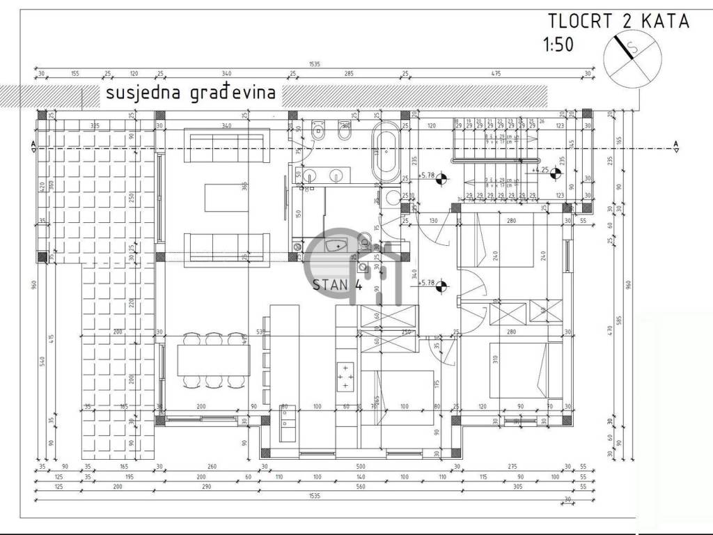 Beautiful spacious penthouse, GrebašticaIn a quiet part of Grebaštica, 170 m by air and 300 m by foot from the beautiful Galešnica beach, attractive apartments located in two smaller buildings. There are five apartments in each building. The town center with all amenities is 750m away.All apartments are south-facing and have a terrace. With different sizes, equipped with air conditioning and quality carpentry, ceramics and floor coverings, these apartments represent an excellent opportunity for a modern buyer.The following apartments are available on the second floor:APARTMENT 5, building A: consists of an entrance hall with a wardrobe, two bathrooms, three bedrooms and a living room (kitchen, dining room and living room in one) with access to a spacious terrace . The total floor area is 101.80 m2.APARTMENT 5, building B: consists of an entrance hall with a wardrobe, two bathrooms, three bedrooms and a living room (kitchen, dining room and living room in one) with access to a spacious terrace. The total floor area is 101.80 m2.The price of one residential unit is €275,000.00.Each housing unit has one outdoor parking space included in the price.