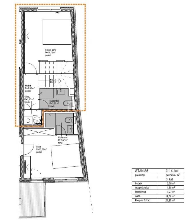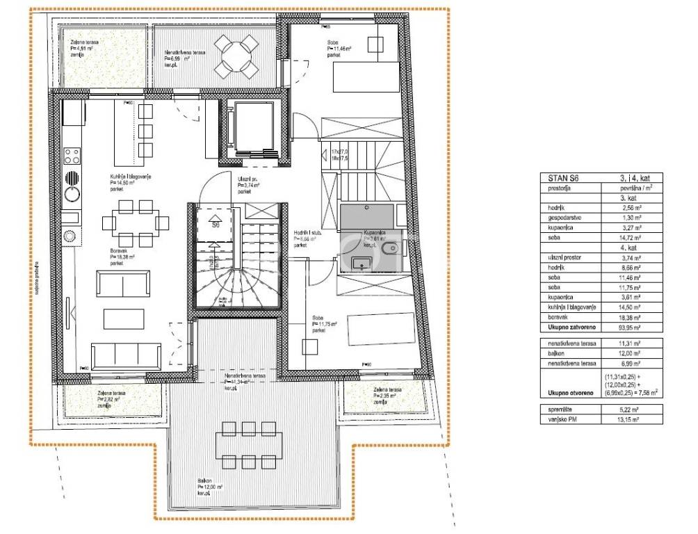 Stan S6 - četverosoban dvoetažni penthouse na trećem i četvrtom katu, zatvorene površine 93,95 m2 s balkonom 12 m2, dvije nenatkrivene terase 11,31 m2 i 6,99 m2, spremištem 5,22 m2 i vanjskim parkirnim mjestom.