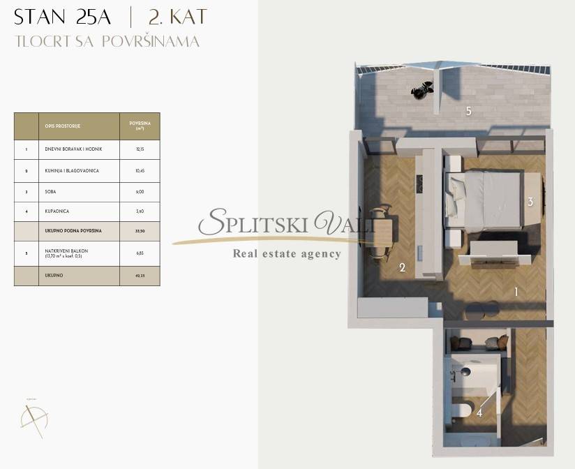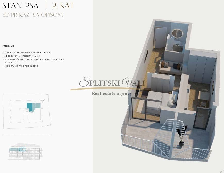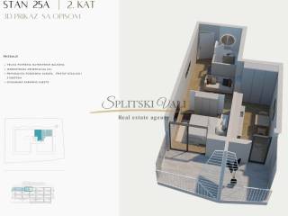 Stan 25A nalazi se na razini drugog kata te se prostire na 42.35m2 netto površine, 35.5m2 unutarnje površine.