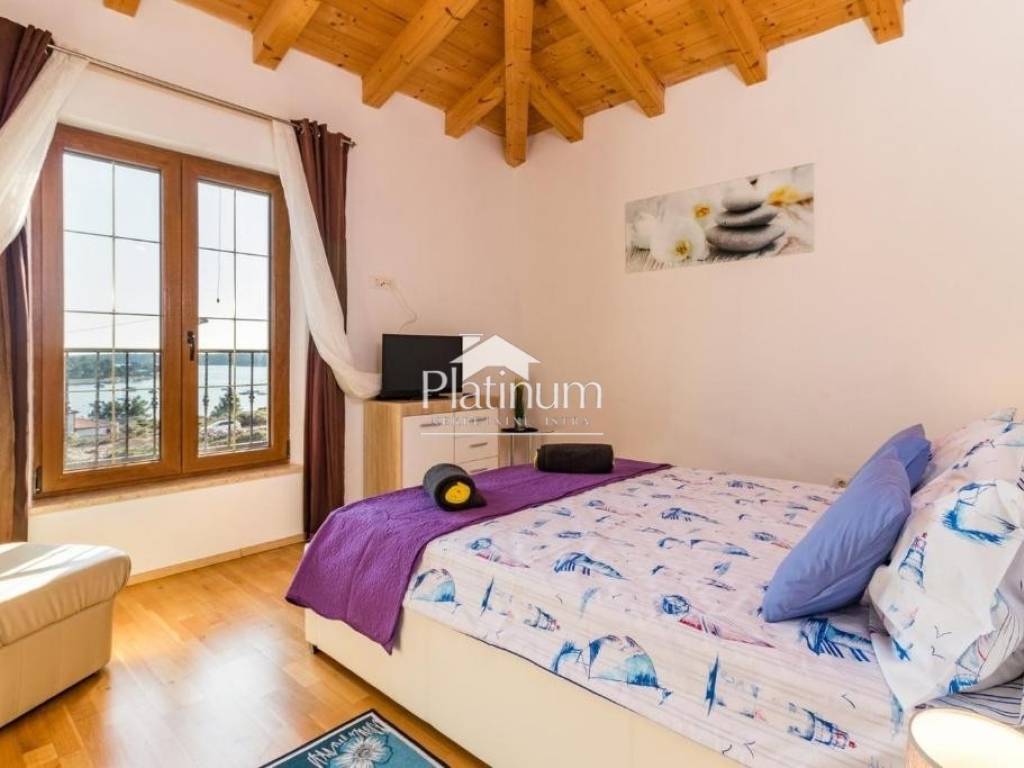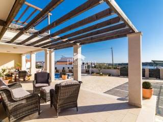 A house for sale in Medulin with a beautiful sea view, 250 m2 spread over two floors. On the ground floor there is a living room with access to the terrace, kitchen and dining room, bedroom with bathroom, toilet, laundry room, storage room and terrace. On the first floor there are three bedrooms, two bathrooms, two balconies with a sea view, one of which is large and covered with a pergola. In front of the house there is a swimming pool with a sunbathing area, and the rest of the garden is paved and very nicely decorated. For all additional information, please contact us at +385976668173.