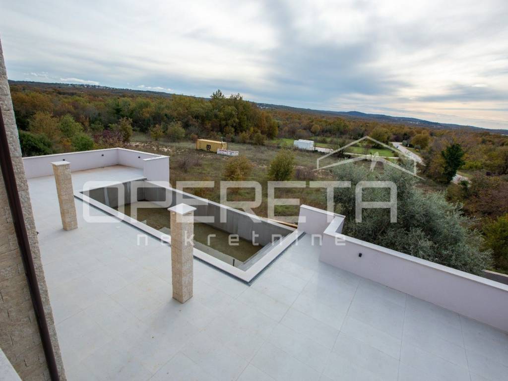 A newly constructed detached home offering unobstructed views, a spacious garage, and a stunning infinity pool. This 210 m² property features five bedrooms in total, with two conveniently situated on the ground floor. It includes three full bathrooms plus an additional guest toilet. The generous kitchen seamlessly connects to the dining area and living room, which opens onto a terrace and complete with an infinity pool overlooking the surroundings, as well as a double garage. The upper level hosts three additional bedrooms. Heating and cooling are ensured through air-conditioning units, with the added option of a fireplace for extra comfort.