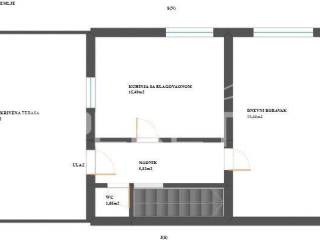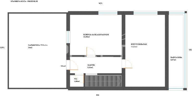 Prizemlje s kuhinjom, dnevnim boravkom, radnom sobom, WC-om i izlazom na natkrivenu terasu