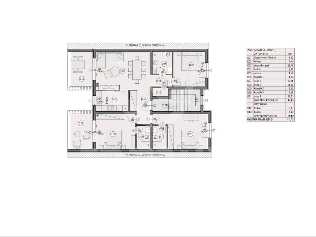 On the 2nd floor of a modern building there is a three-bedroom apartment with a total area of 111.73 m2, of which 94.93 m2 is indoor living space, while an additional 16.80 m2 belongs to two balconies. The apartment is extremely thoughtfully arranged and consists of a spacious entrance area / hallway, separate kitchen, large and bright living room, 3 comfortable bedrooms, even 3 bathrooms, which is a rarity and a great advantage in everyday life, an additional hallway connecting the private part of the apartment, a storage room and two balconies, ideal for morning coffee or evening relaxation.