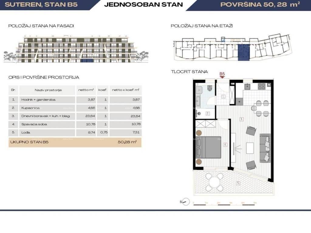 Luxury apartments with a view of Marina Veruda!Apartment B5, with a net usable area of 51.59 m² (net usable area of 50.03 m²), is located in building B. The apartment is situated on the ground floor and consists of a hallway with a wardrobe, a living room with a kitchen and dining area, 1 bedroom, a bathroom, and a loggia.The apartments are sold on a "turnkey" basis, with a fully furnished bathroom (furniture and sanitary ware), flooring in all rooms (1st class ceramics, laminate), completed electrical installations, built-in air conditioning, interior carpentry, exterior PVC or ALU carpentry, anti-burglary and fireproof entrance doors, antenna system, UTP network, and walls and ceilings painted white.A storage room is included in the price of the apartment, while a parking space is available for an additional fee.The price of the garage space is 35,000 euros.Note: VAT is included in the price.For additional information, please contact:Azra +385 91 6115706 +385 98 420885 azra@almadominvest.com