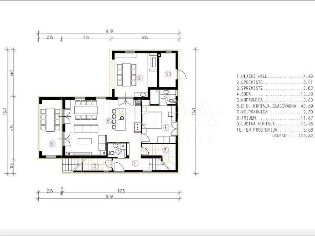 Island of Krk, Malinska - Mediterranean villa with pool! The villa has an area of 196.58 m2 and consists of a ground and an upper floor. On the ground floor is an entrance area, a toilet with a laundry room, two storage rooms, a bedroom with a bathroom, a kitchen with a dining room and a living room with access to a covered terrace. A part of the ground floor is also an outdoor kitchen and a technical room. On the first floor, connected by an internal and external staircase, are three bedrooms and three bathrooms. Two rooms have access to a covered terrace with sea view. A pool and a landscaped parking space will in the Garden area. Quality construction and equipment, top-quality ceramics, sanitary facilities and underfloor heating with a heat pump. Nice location in a quiet island settlement, not far from all amenities, only 2 km from the center and the sea. Completion is scheduled at the end of 2024. ID CODE: EI-5448 Josip Šikić, mag.oec Agent s licencom Mob: +385 91 890 4694 Tel: +385 51 403 771 E-mail: info@joda-nekretnine.hr www.joda-nekretnine.hr