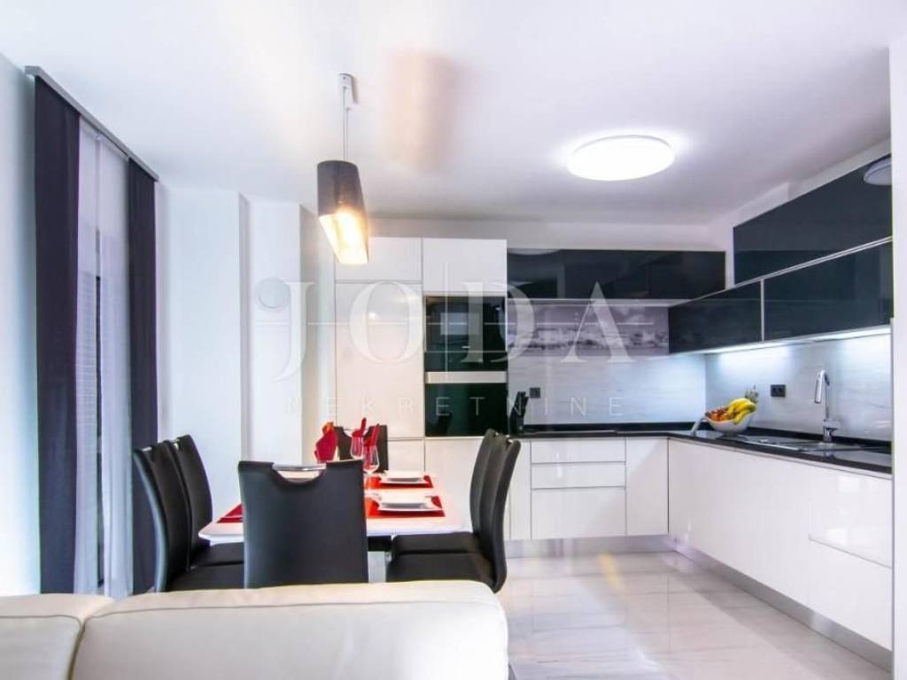 Island of Krk, surroundings of the town of Krk, semi-detached house with a swimming pool in a quiet location  For sale is a semi-detached house of recent construction not even 10 minutes' drive from the town of Krk and the sea. It is surrounded by holiday homes and there is a small shop and restaurant in the village. The house spreads over 3 levels and consists of two apartments and a basement. The ground-floor apartment consists of two bedrooms, a bathroom, a hallway, a living room with a kitchen and dining room and an exit to a terrace that leads to a garden with a heated pool, an outdoor shower and a barbecue. The basement is arranged as a tavern with a sauna, jacuzzi and kitchen - in one part, while in the other part is a laundry room, a bathroom and a technical room. On the first floor, which is accessed by an external staircase, is an apartment with two bedrooms, a bathroom, a living room with a kitchen and dining room, and a covered and uncovered terrace.  The basement and ground floor have underfloor heating via a heat pump in all rooms, as well as air conditioners and a fan coil system, on the first floor are only air conditioners. An ideal opportunity to take over the well-established business of tourist rental!   ID CODE: EI-5879  Josip Šikić, mag.oec Agent s licencom Mob: +385 91 890 4694 Tel: +385 51 403 771 E-mail: info@joda-nekretnine.hr www.joda-nekretnine.hr