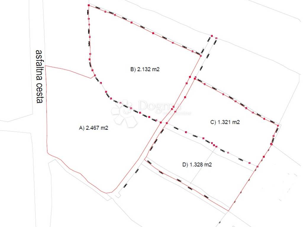 Land Area: 2467m, divided into several parcels of different sizes. Location: Asphalted road access, infrastructure just by the land. Construction: Construction allowed (1/1 ownership).
