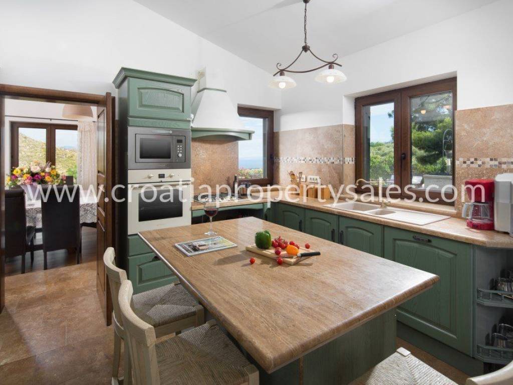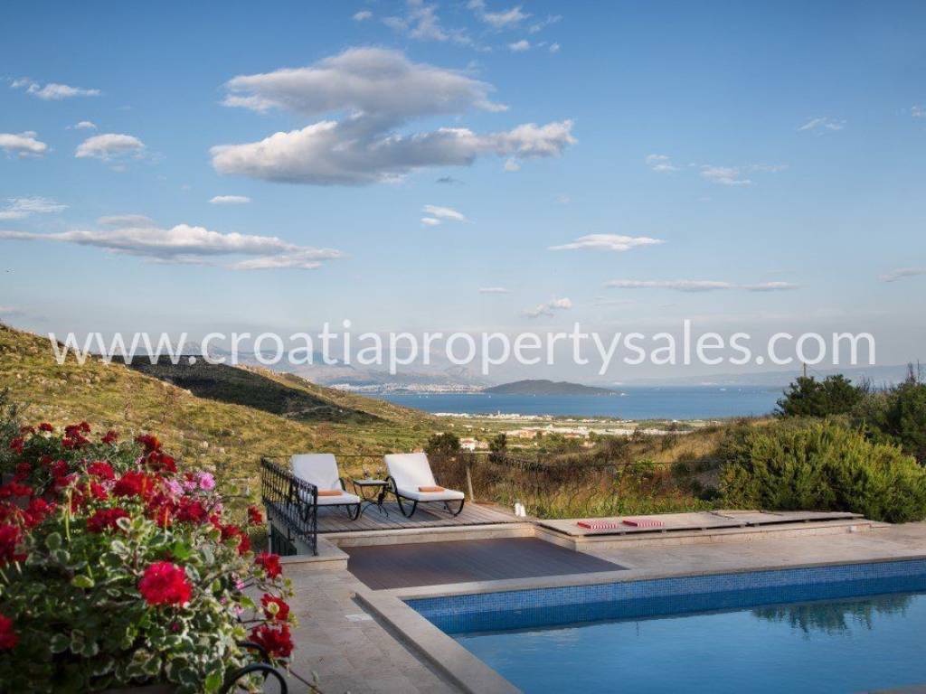 Unique villa in the style of a Mexican hacienda, with a large olive grove and incredible panoramic sea views.The property extends to 14208 m2, is fully fenced, and is located on the slopes of Kozjak with panoramic views of the Kastela Bay, Kastela and Split.There are 350 well-kept olive trees on the plot. The living space consists of a main house, a small, old dalmatian tavern, and two smaller additional houses.Beautifully furnished, rustic style main house, consists of three floors, 4 bedrooms, 4 bathrooms, gallery, living room, kitchen, dining room, and outdoor seating area.Next to the main house there is a wine cellar, which currently houses devices for processing olives.Next is a smaller house, which would be ideal for housing staff. It also has a garage for two vehicles. In the yard there is another smaller house, ideal for a gym.Surrounded by all houses there is a swimming pool and a large sunbathing area with spectacular view of the valley and the bay.The property provides complete privacy on a large, fenced plot. The city of Split is 25 km away.